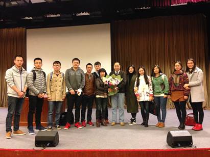 在大家的掌声当中,学生代表也上台给徐教授进行献花,感谢徐教授下午给15级学生带来的精彩报告,管硕151班支部的成员,也上台和平易近人、学识深厚的徐教授进行合影留念。相信通过今天的讲座,包括管硕151班在内的所有15级同学们都能够弘扬起作为一个研究生应有的科学道德,塑造起踏实而又严谨的学风!