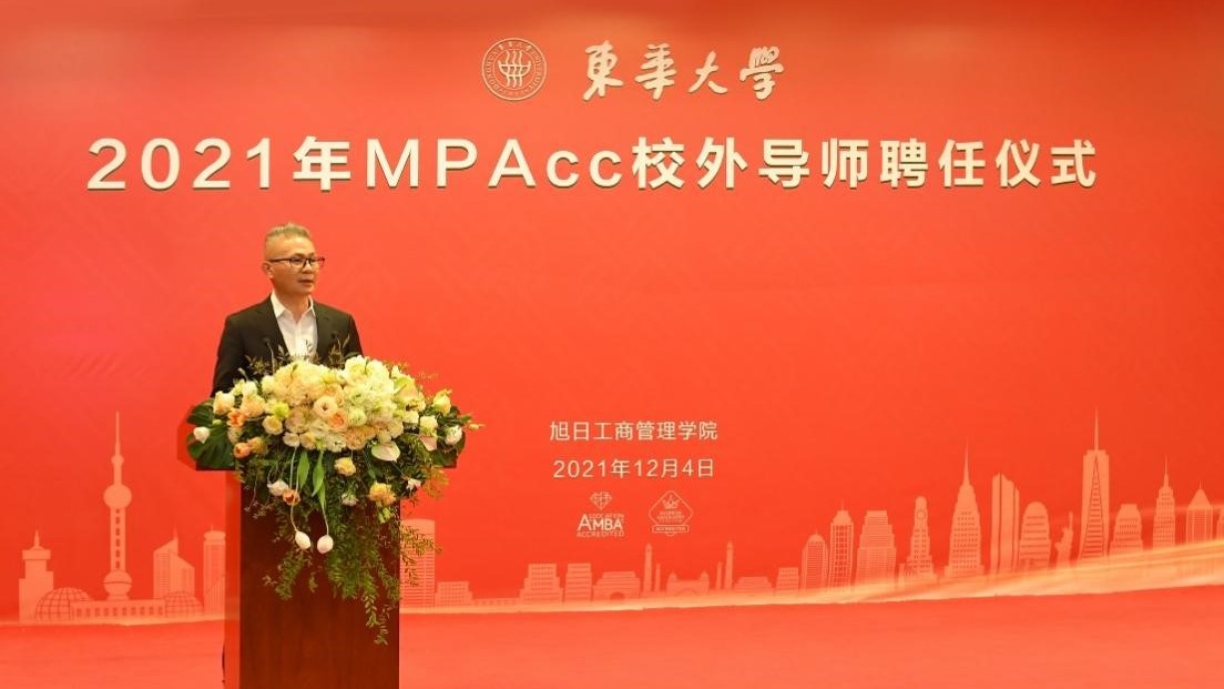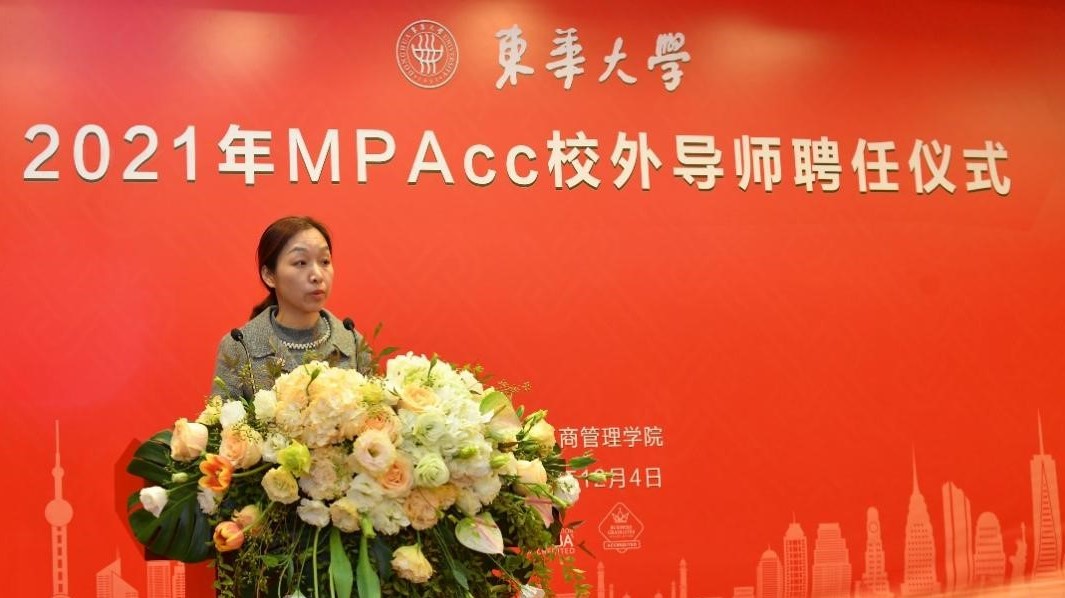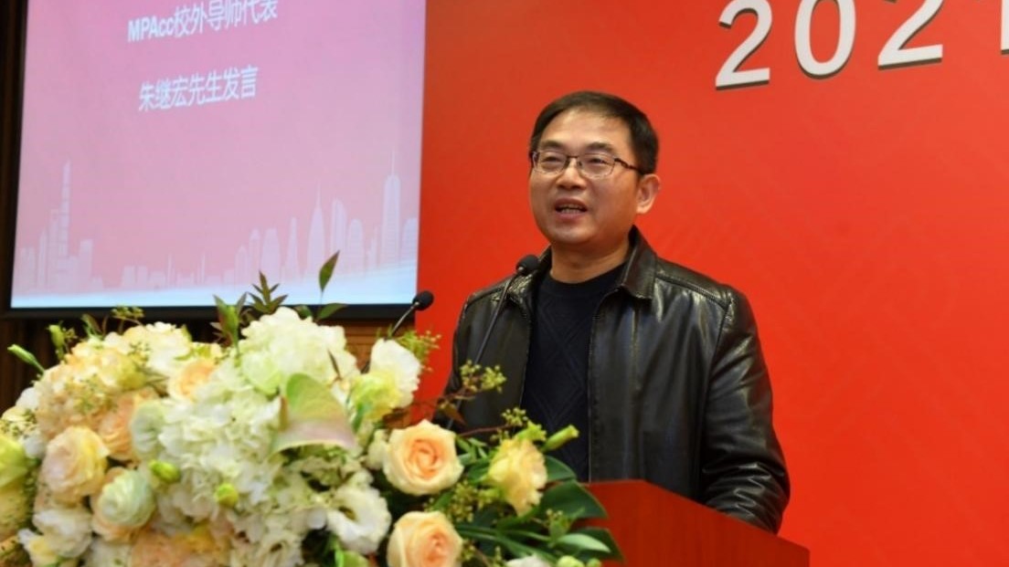 来自光明食品集团上海五四有限公司高级会计师朱继宏先生作为校外导师代表发言。他表示,今天被聘为东华大学MPAcc校外导师感到十分的荣幸和高兴,作为一名会计人,依然对三尺讲台情有独钟,今天将以另一种形式继续着自己的梦想,将认真履行导师的职责,积极做好校内导师的助手,帮助更多学生提升自身专业技能和综合实力的同时,为东华大学MPAcc培养和发展贡献自己的力量。