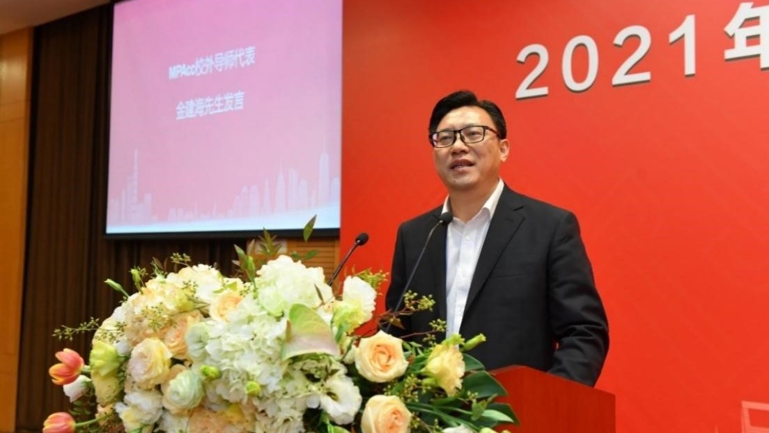 来自中兴财光华会计师事务所(特殊普通合伙)上海自贸试验区分所高级会计师金建海先生作为校外导师代表发言。他讲到,三年前非常荣幸被东华大学聘为校外导师,深深感到这份荣耀和责任,今天再次被东华大学聘为校外导师,在未来的三年内,会继续努力发挥自己的专业特长,将在工作中积累的会计财务经验等知识和大家一块分享和学习,并帮助学生规划合理的职业发展道路,为学生带来新视野、新理念和新思路,助力学生能够快速成长,成就未来。