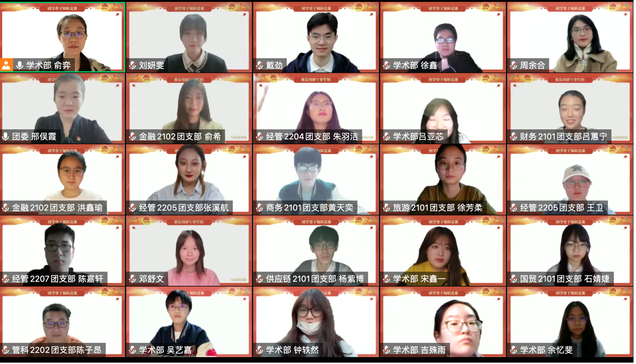 恰逢金秋十月,党的二十大顺利闭幕。11月6日下午,东华大学彩民之家 团学骨干知识竞赛通过线上形式成功举办,彩民之家 专职辅导员戴劲、兼职辅导员周余合、彩民之家 团委书记邢俣霞出席复赛并担任评委老师。