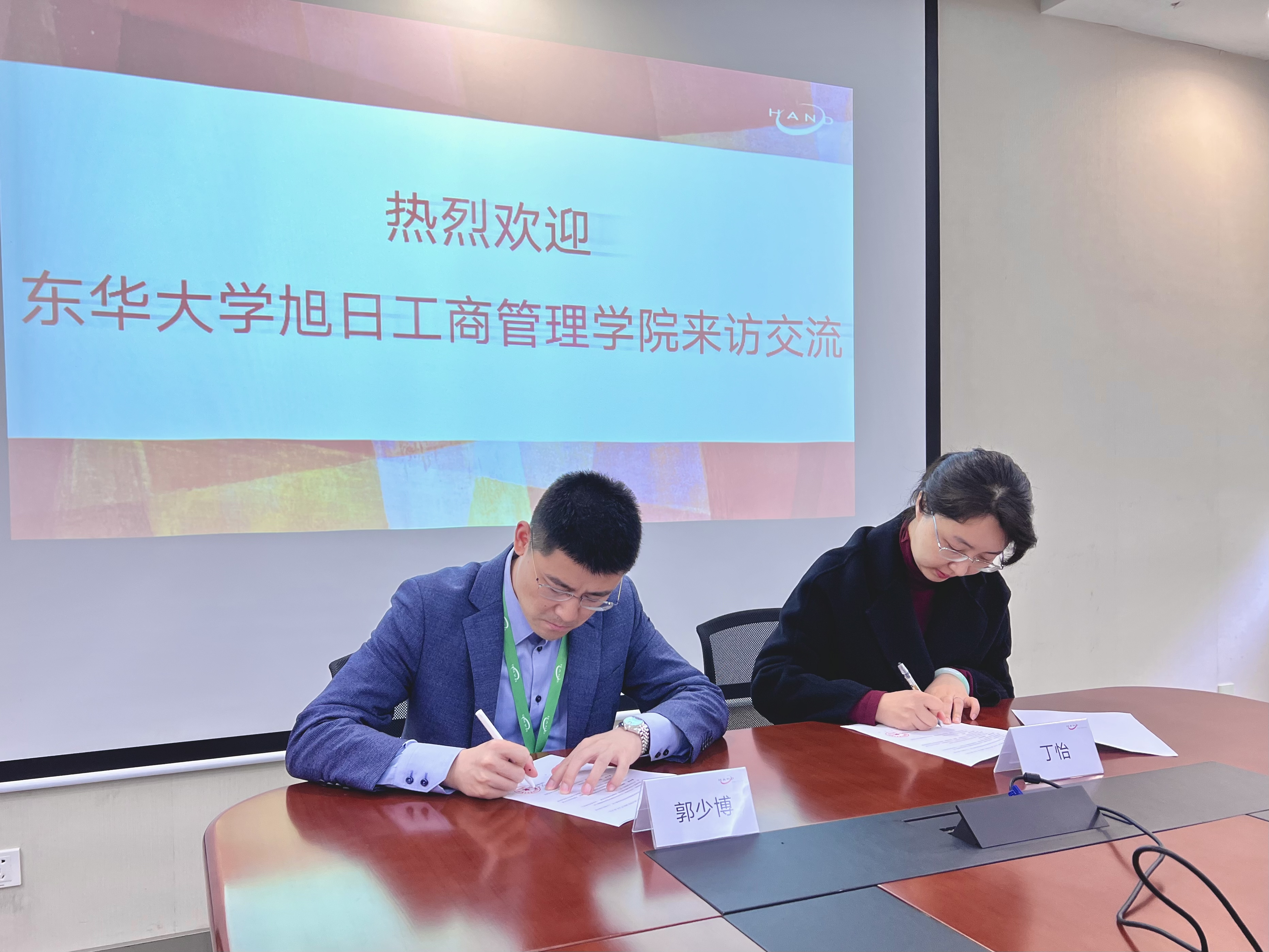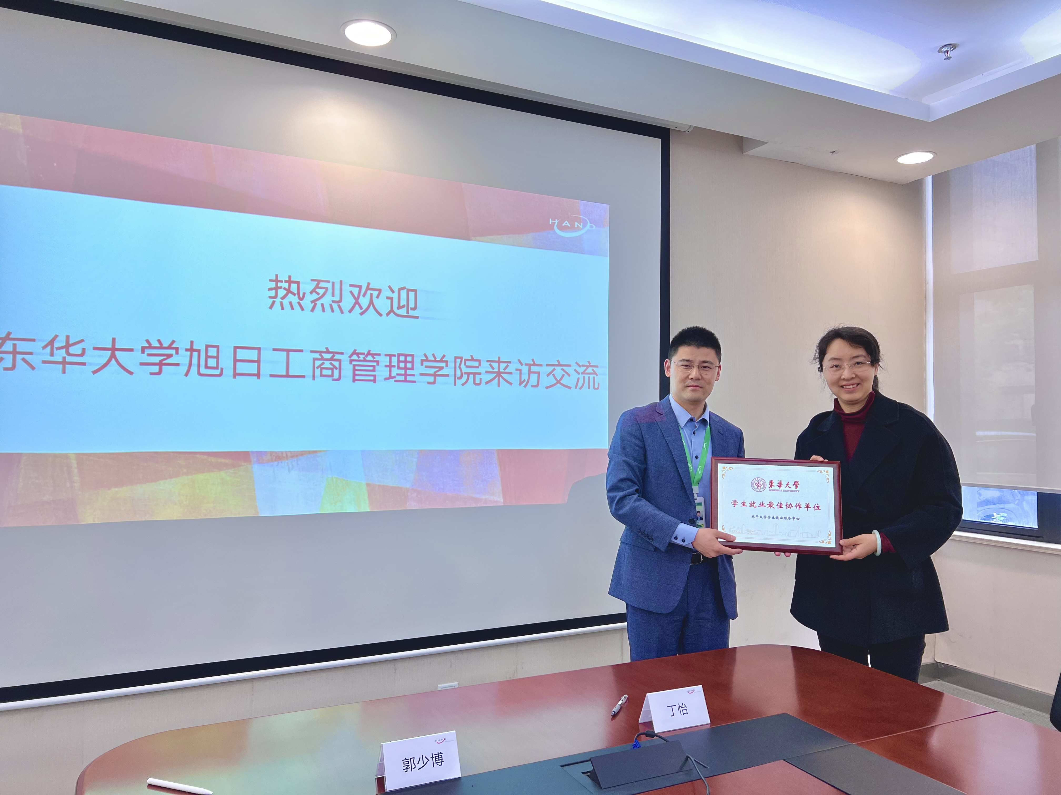 丁怡和郭少博分别代表学院和汉得签署就业实习实践基地框架协议,丁怡代表学院向汉得颁发东华大学2023年学生就业最佳协作单位铭牌。