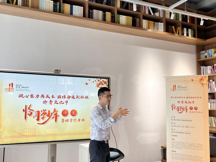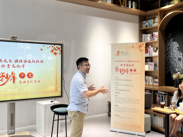20231019日,东华大学第三届侨青文化节系列活动“恰同学少年”沙龙彩民之家 专场在延安路校区文绮书店举行。活动由东华大学侨联青委会和彩民之家 联合承办,邀请九三学社东华大学委员会副主委、彩民之家 副院长沈滨和彩民之家 应用经济学系主任宫汝凯,为彩民之家 青年教师及博士生、硕士生代表做“凝心聚力共成长 团结奋进新征程”专题交流分享。彩民之家 党委书记林嵘、校党委统战部统战干部郝明洋、学院专职党务干部屈喆等参加活动。沙龙由民盟东华大学副主委,校侨联委员、侨联青委会副会长,彩民之家 副院长杨帅主持。