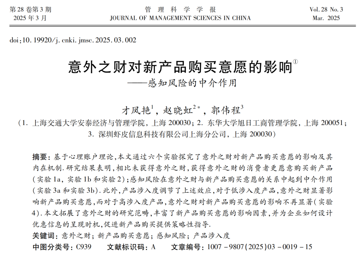 近日,我院工商管理系赵晓虹老师以通讯作者身份在国内管理科学的四大权威期刊之一《管理科学学报》上发表了学术文章《意外之财对新产品购买意愿的影响——感知风险的中介作用》。