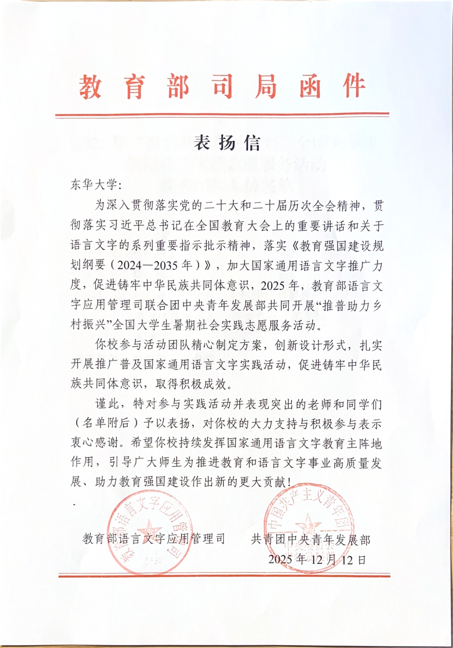 据介绍,语言文字是人类社会最重要的交际工具和信息载体,是文化的基础要素和鲜明标志。东华大学积极响应党和国家政策,发挥高校在国家通用语言文字推广普及和中华优秀语言文化传承发展等方面的人才优势和学术优势,经过长期的建设和发展,已经建成“上海市语言文字规范化示范校”“中华经典诵写讲基地”等平台,获评国家语言文字推广基地。学校依托师生暑期社会实践平台开展“推普助力乡村振兴”志愿服务,有效发挥了语言文字传承、弘扬历史文化,铸牢中华民族共同体意识的功能。