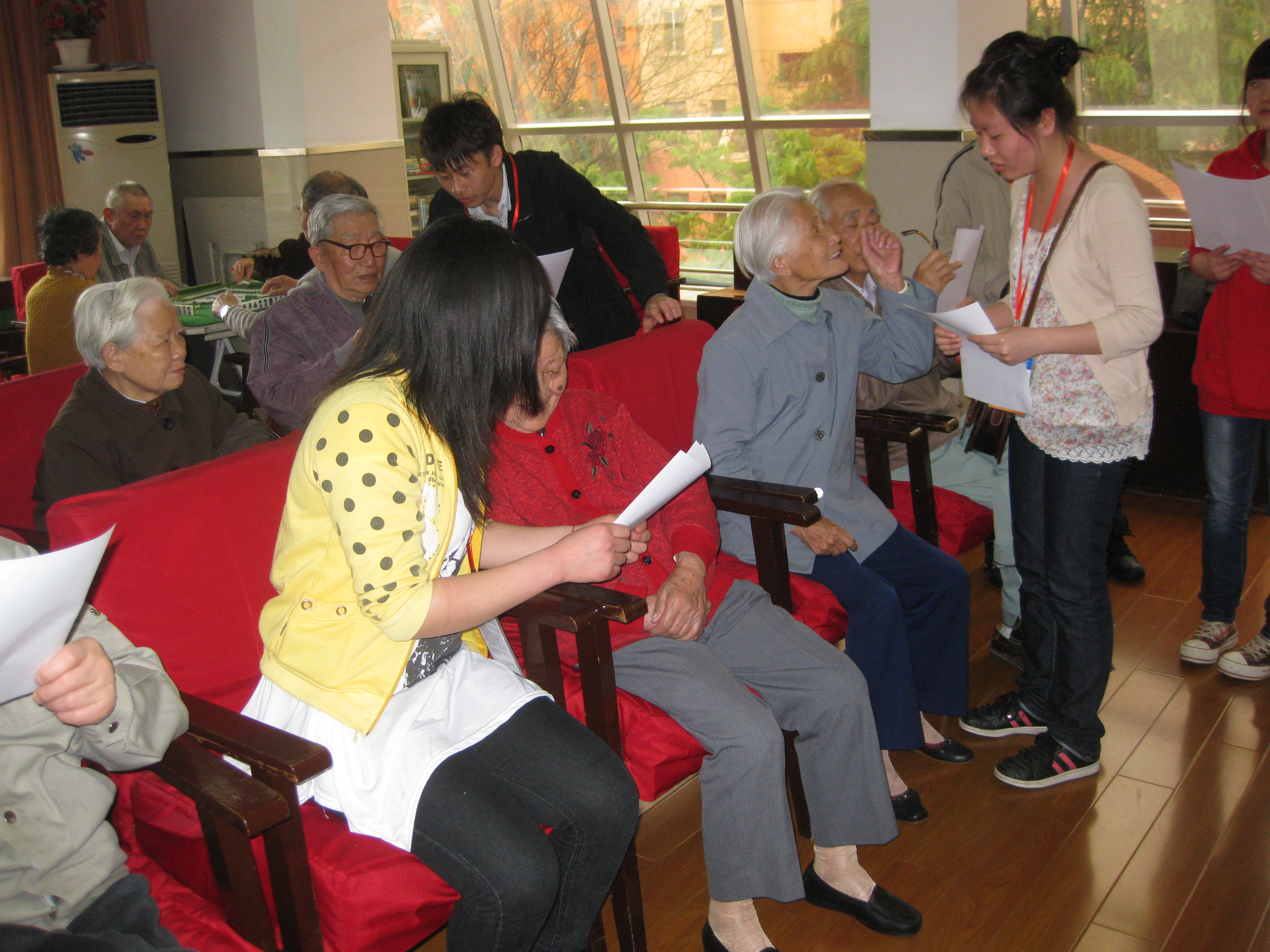 队员们唱完歌后,紧接着开展了为老人们讲解保健之道的活动,一对一的讲解,和老人们一起互动,闲话家常,其乐融融。尽管大家都有些不舍,时间还是如白驹过隙一般,两个小时的探望一下子就过去了,在没有任何伴奏的情况下,十四名志愿者一齐再次大声歌唱《感恩的心》,一曲过后,队员们深深的向老人们鞠躬,老人们也齐齐鼓掌,并对我们的探访表示感谢。等先把老人们送回房间后,队员们也依依不舍地离开了,还有老人赶过来送我们并且激动地说,下次一定还要来,非常欢迎。