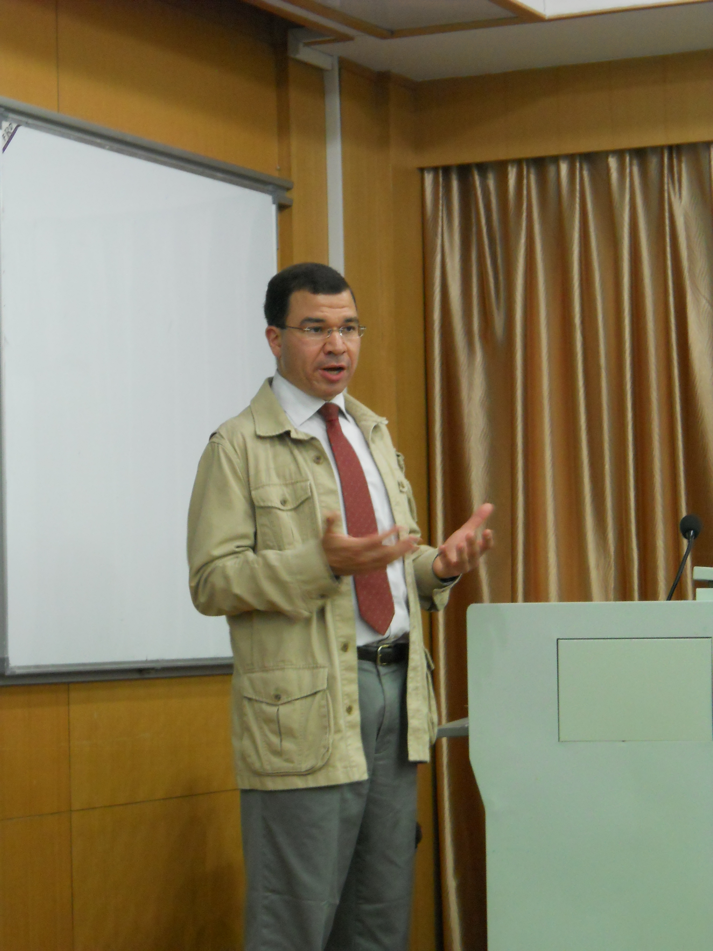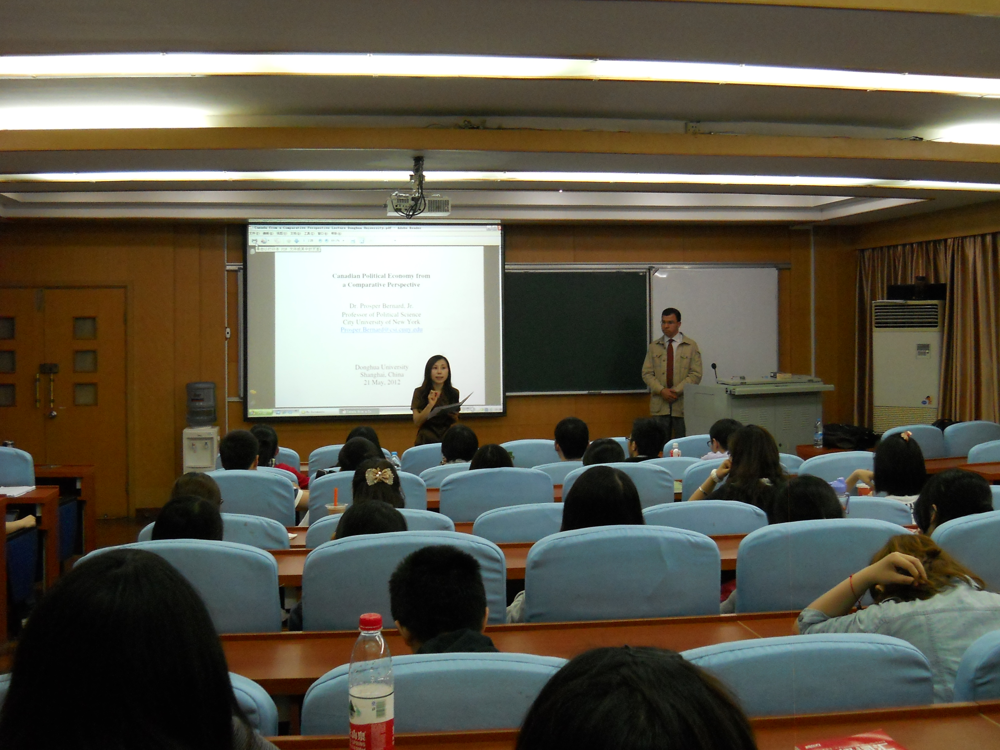 2012年5月22日晚6:30,在旭日楼211教室,纽约城市大学政治经济学教授Prosper Bernard为我校师生带来了一场精彩纷呈的学术讲座。讲座主题为基于比较视角的加拿大政治经济环境解析。出席本场讲座的老师有彩民之家 工商管理系主任沈蕾老师和喻葵老师。