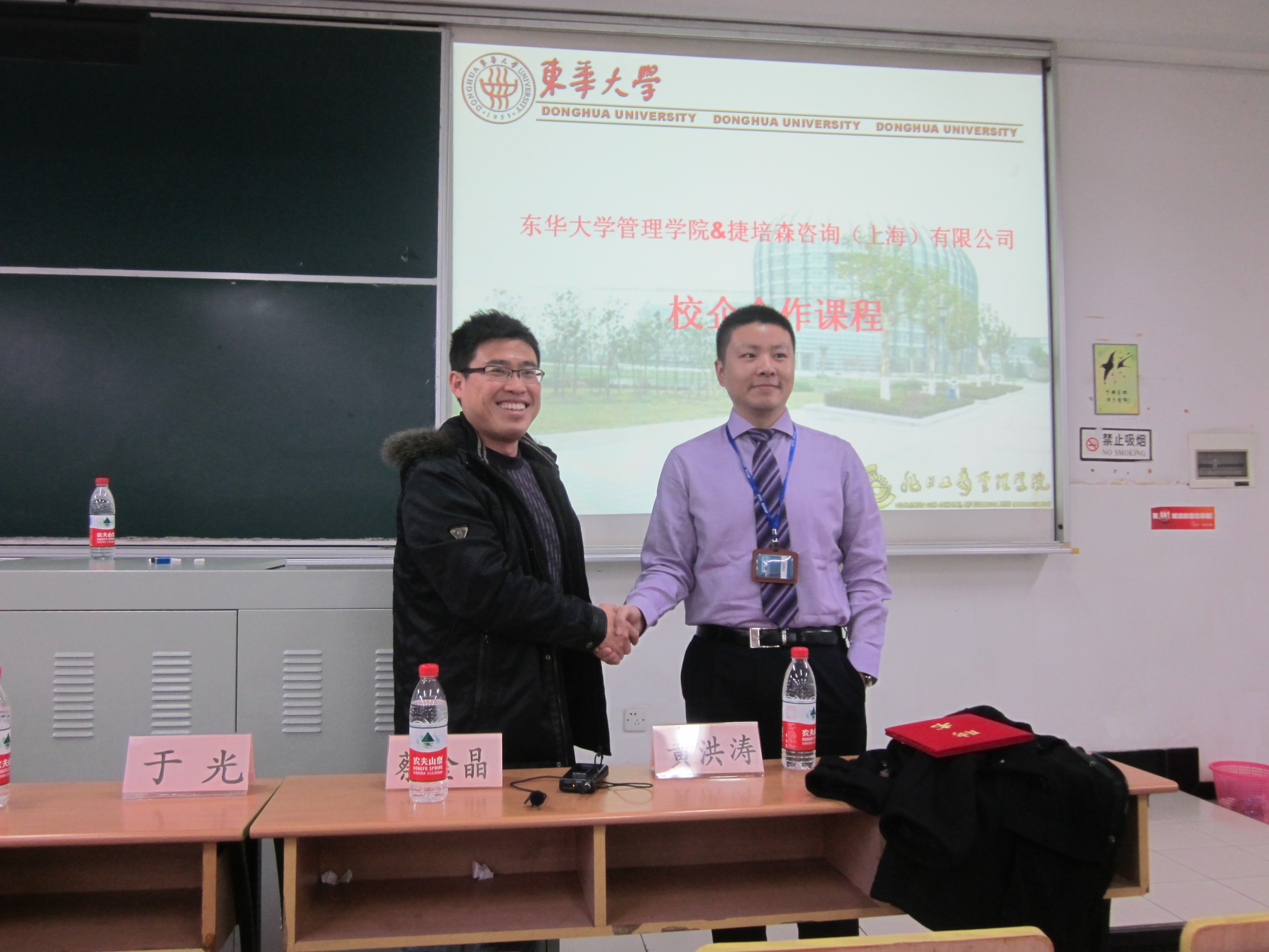 2012年11月29日下午15:30在4教210开展了东华大学彩民之家 &捷培森咨询(上海)有限公司校企合作课程。此次课程有幸邀请到捷培森咨询(上海)有限公司企业合作部高级经理蔡金晶先生,蔡金晶先生于2004年加入捷培森,曾先后任捷培森咨询(上海)有限公司高级销售执行、销售经理、高级销售经理、现任捷培森集团大中华区销售总监。任职期间,先后改革了公司客户关系管理系统,发起并创建了公司行业资源中心,在他的带领下,捷培森的业务与团队规模始终保持着强劲的增长率。经过9年的积累,蔡总监拥有会展行业丰富的实践经验,与各相关行业著名公司建立了广泛而良好的合作关系。出席此次课程的有彩民之家 党总支副书记于光老师、彩民之家 辅导员办公室副主任王丽华老师、辅导员黄洪涛老师。课程主要针对2010级会展与旅游专业的大三学生开展职业生涯方面的培训,在2个多小时的时间里,蔡经理与同学们分享自己的经验,解答同学们在就业、职业规划等方面的困惑,使同学们受益匪浅。 首先,彩民之家 党总支副书记于光老师向蔡金晶经理颁发了“彩民之家 生涯指导导师”的聘书,拉开了东华大学彩民之家 和捷培森咨询(上海)有限公司校企合作课程的序幕。