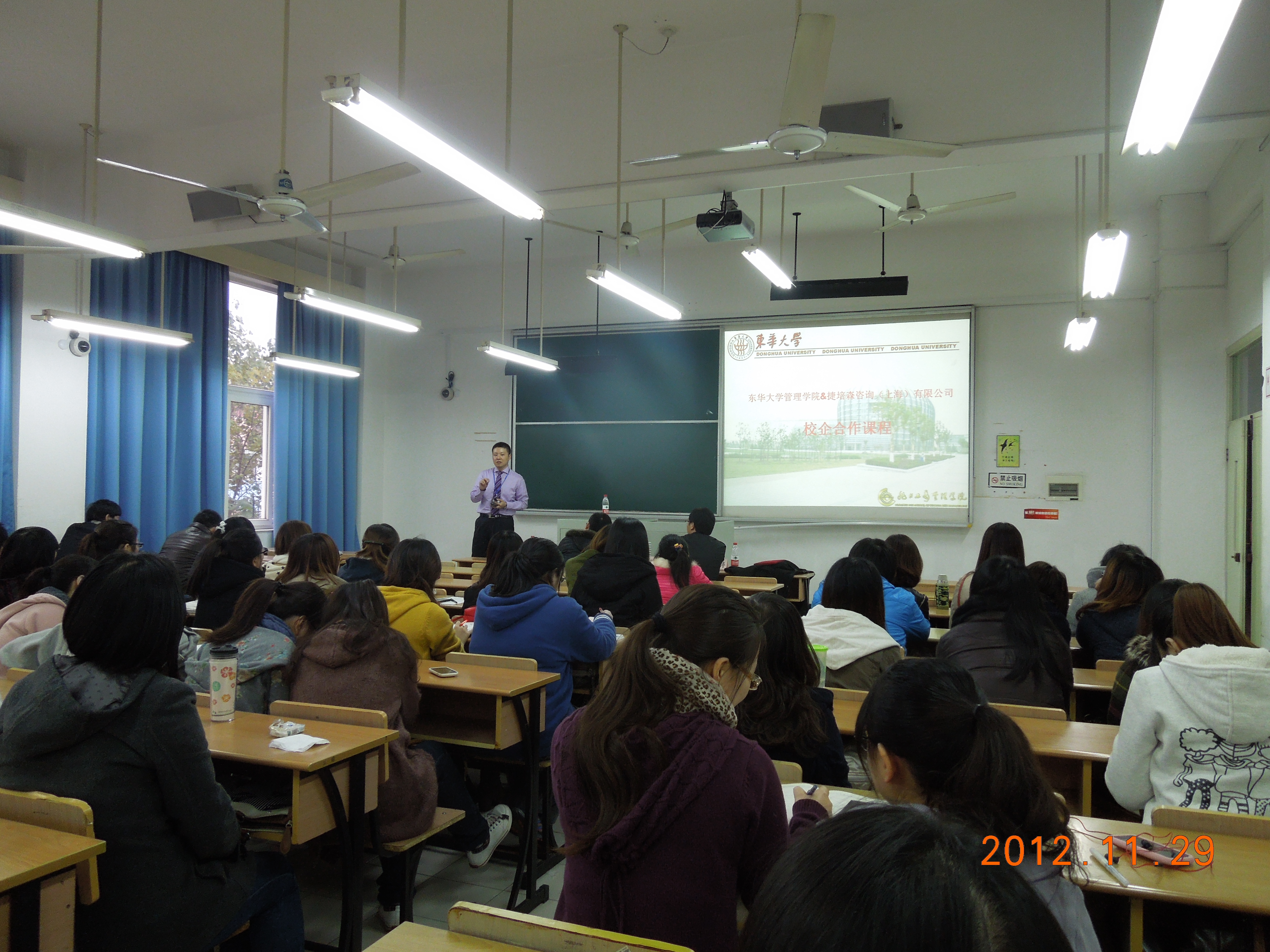 2012年11月29日下午15:30在4教210开展了东华大学彩民之家 &捷培森咨询(上海)有限公司校企合作课程。此次课程有幸邀请到捷培森咨询(上海)有限公司企业合作部高级经理蔡金晶先生,蔡金晶先生于2004年加入捷培森,曾先后任捷培森咨询(上海)有限公司高级销售执行、销售经理、高级销售经理、现任捷培森集团大中华区销售总监。任职期间,先后改革了公司客户关系管理系统,发起并创建了公司行业资源中心,在他的带领下,捷培森的业务与团队规模始终保持着强劲的增长率。经过9年的积累,蔡总监拥有会展行业丰富的实践经验,与各相关行业著名公司建立了广泛而良好的合作关系。出席此次课程的有彩民之家 党总支副书记于光老师、彩民之家 辅导员办公室副主任王丽华老师、辅导员黄洪涛老师。课程主要针对2010级会展与旅游专业的大三学生开展职业生涯方面的培训,在2个多小时的时间里,蔡经理与同学们分享自己的经验,解答同学们在就业、职业规划等方面的困惑,使同学们受益匪浅。 首先,彩民之家 党总支副书记于光老师向蔡金晶经理颁发了“彩民之家 生涯指导导师”的聘书,拉开了东华大学彩民之家 和捷培森咨询(上海)有限公司校企合作课程的序幕。