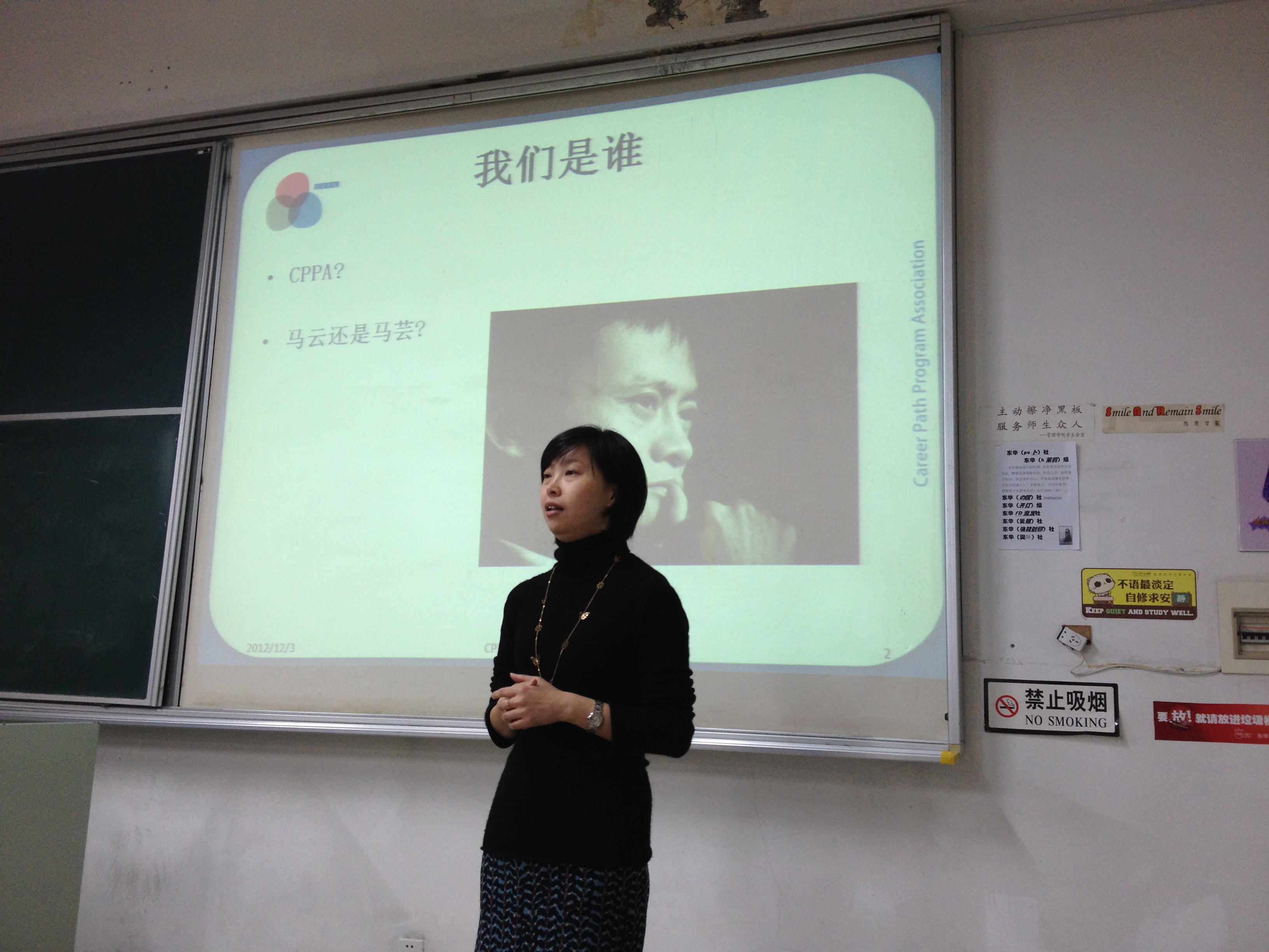 2012年12月3日晚,彩民之家 2010级于4教110开展了工商大类职业生涯发展教育月系列活动之职场入门讲座,旨在为同学们将来的实习之路,求职关卡等做出引导。这次讲座我们有幸请来了Trairspace从事人力资源的马芸女士为同学们讲述职场入门这一课。