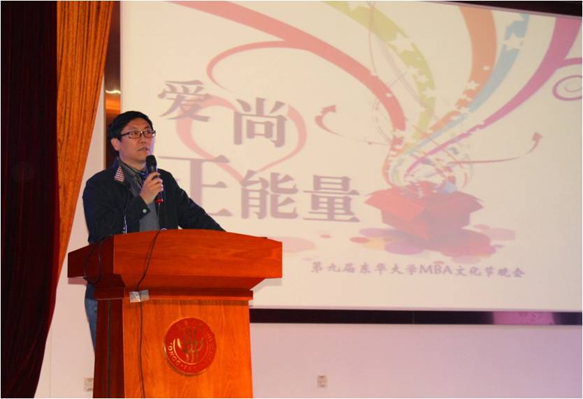 12月29日晚,申城“如约”飘雪,扬扬洒洒的飞雪并没有影响东华大学MBA同学们的热情。第九届东华大学MBA“爱·尚·正能量”主题文化晚会在旭日楼演讲厅顺利进行。无论是精彩纷呈的班级风采展示,靓点频出的才艺表演,摄影大赛作品的点评,还是爱心送暖的感动,都充分诠释了热爱生活、追逐时尚、心系慈善的文化节主题。 晚会由综合六班杨雯、领袖班秦辞海及我校国际文化交流学院的俄罗斯女孩Rita共同主持。彩民之家 副院长赵晓康、MBA教育中心主任刘长奎、上海MBA联谊会秘书长陆腾、副秘书长葛飞等领导莅临出席。上海财经大学、同济大学、华东理工大学、上海大学及上海外国语大学等兄弟院校的MBA联合会代表应邀出席。 晚上7时,西敏班康鹏同学一曲劲歌拉开了晚会的帷幕。赵晓康副院长代表学院致辞。他首先向文化节的顺利举行表示祝贺,充分肯定MBA文化节对校园活动及MBA精神文化建设的贡献,希望MBA同学们能够在两年的学习时间里,把握机遇,增长才干,结交师友,在做好学业的同时,得到课堂以外更多的收获,并提前预祝大家新年快乐。