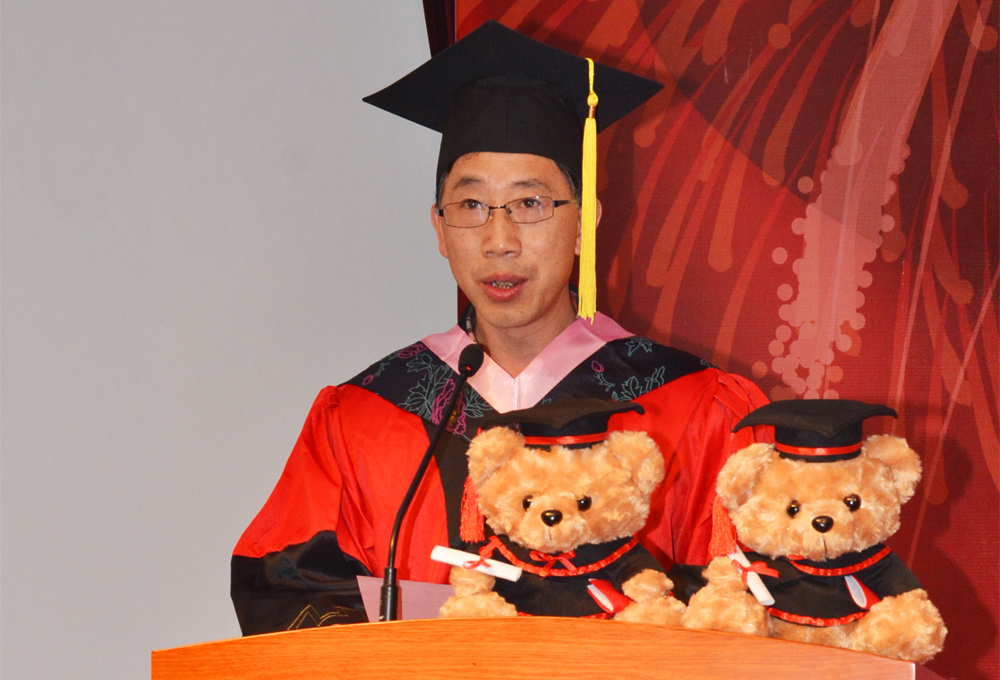 激动人心的学位授予仪式在研究生部主任舒慧生教授宣读完了学校学位评定委员会决议之后隆重举行。随着激昂的加冕进行曲,毕业生们身着硕士服,头戴硕士帽,逐个上台,由副校长邱高郑重地为他们颁发学位证书。接着,毕业生们在现场录制的感言视频又将会场的气氛掀起了一阵高潮。观赏完自己与同窗们的毕业留念视频后,毕业生代表们向导师送出了精美别致的毕业小熊。