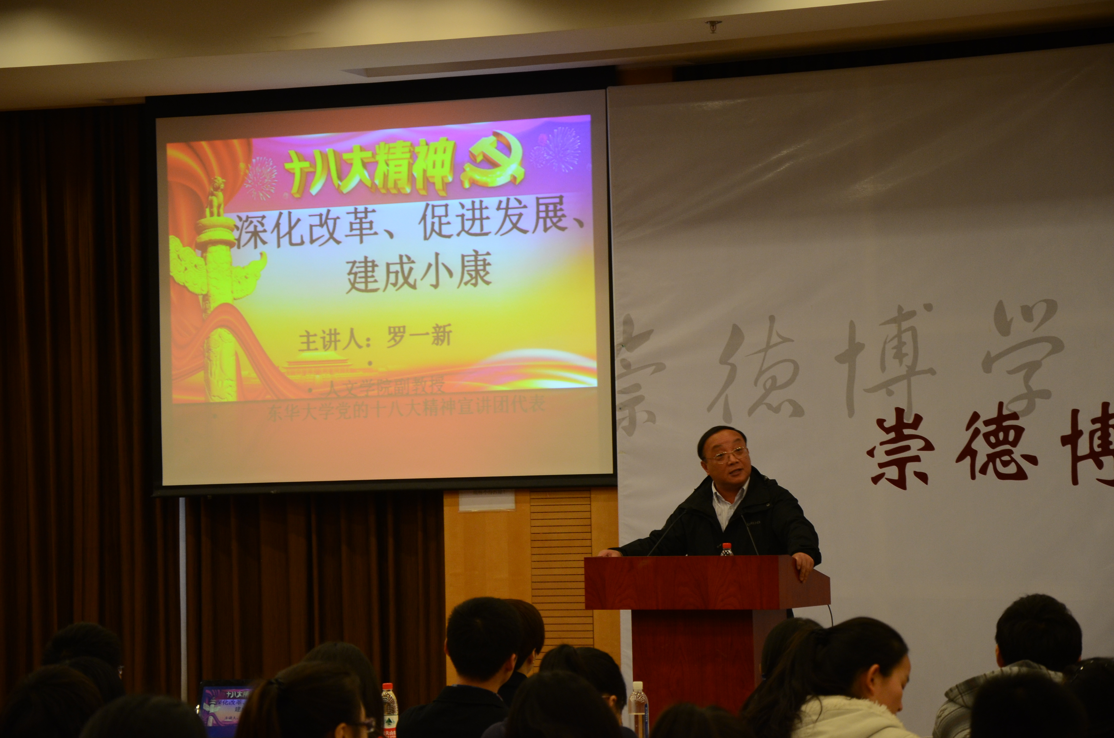 以人生经历为引,罗老师生动形象的解读了十八大关注和讨论的关于深化改革的问题。在回顾改革历史,讲述分析各国发展历程后罗老师更深一步的探讨了改革的必要性与任重道远,更进一步阐释了十八大精神所在。新思想、新观点、新提法、新举措,罗一新老师以幽默风趣描述,用最简单、最明了的语言全面阐述了十八大中全面发展、建成小康的议题,现场不时响起热烈的掌声。