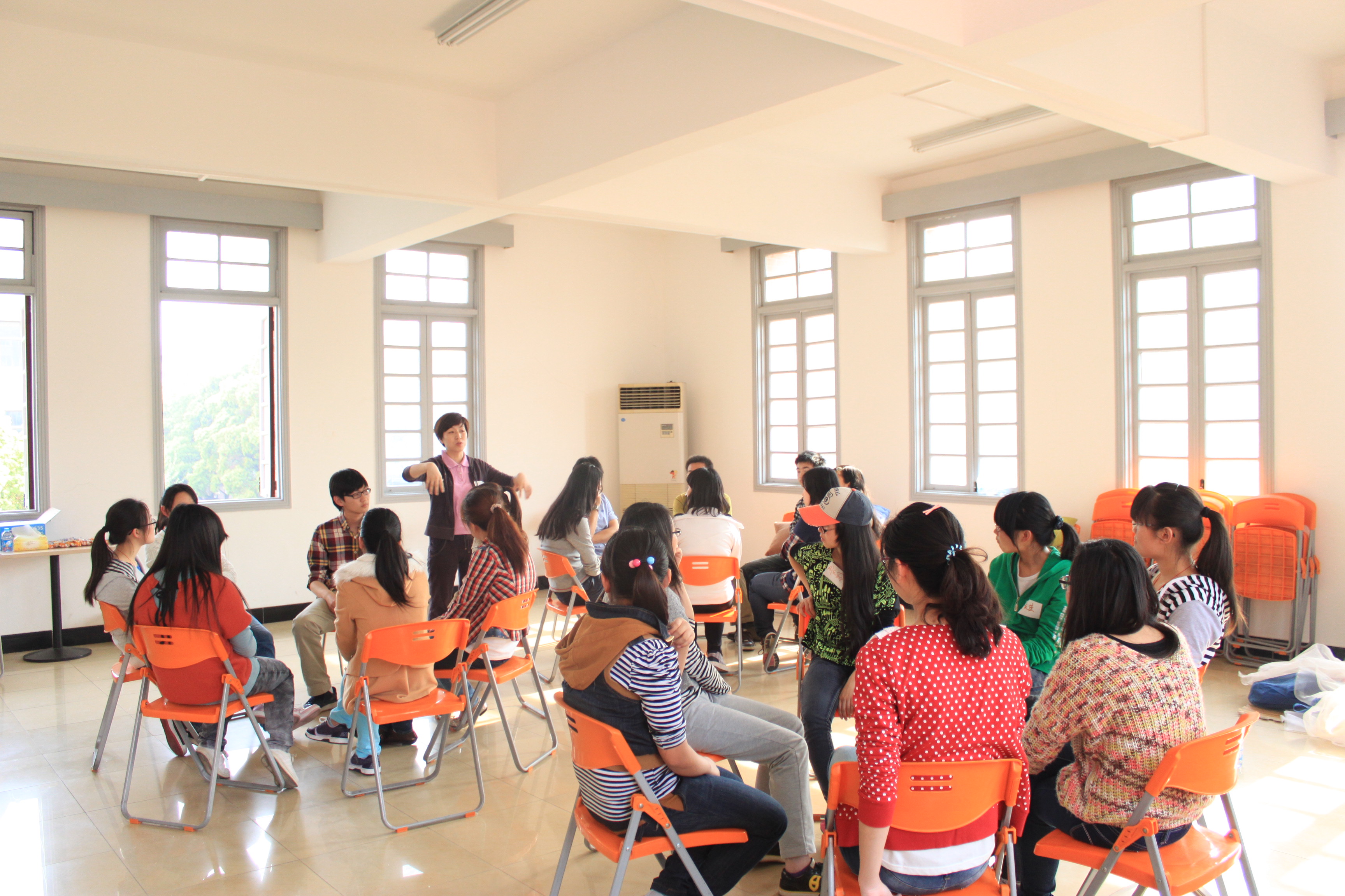 活动一开始,为建立同伴之间的信任,促进彼此交流。江娥老师首先带领我们进行了 “我的心情纱巾”游戏。活动中,成员选择最钟爱的纱巾颜色,来反映各自心情状态。这使得同伴之间得到了初步的认识与了解。接着,我们进行了抢座位的“大风吹”素质拓展游戏,这调动了现场气氛,成员们积极参与,彼此了解逐步加深。 热身游戏结束,我们进行了以支配与被支配为主题的“牵线木偶”素质拓展。在这一过程中,成员结合生活和工作实际,互相分享从游戏中带来的启示。其中一位同学说到,在上级指令一层一层传达到基层的过程中,若直属上级指令不明确,易造成下级工作混乱。其他成员也得到“牵一发而动全身”的启示。为加深彼此认识,使成员认清自我,我们接着开展了“你演我说”和“童话故事扮演”游戏。其中,在“童话故事扮演”游戏中,江娥老师积极引导我们,游戏可以反映个人性格与做事方法,是实际生活的映射。游戏中我们的行为方法往往暗示了生活中我们的处事方法。就此,成员生活实际相结合,各抒己见,认清自己在任务中的作用。在互相提点和自我反省中,成员对自己有了更深入的了解。