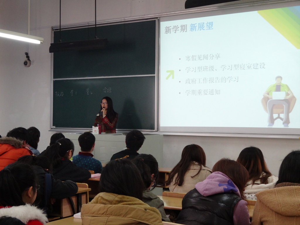 班会分为四部分召开,分别为:寒假见闻分享;学习型班级,学习型寝室的建立;政府工作报告的学习;学期重要通知。