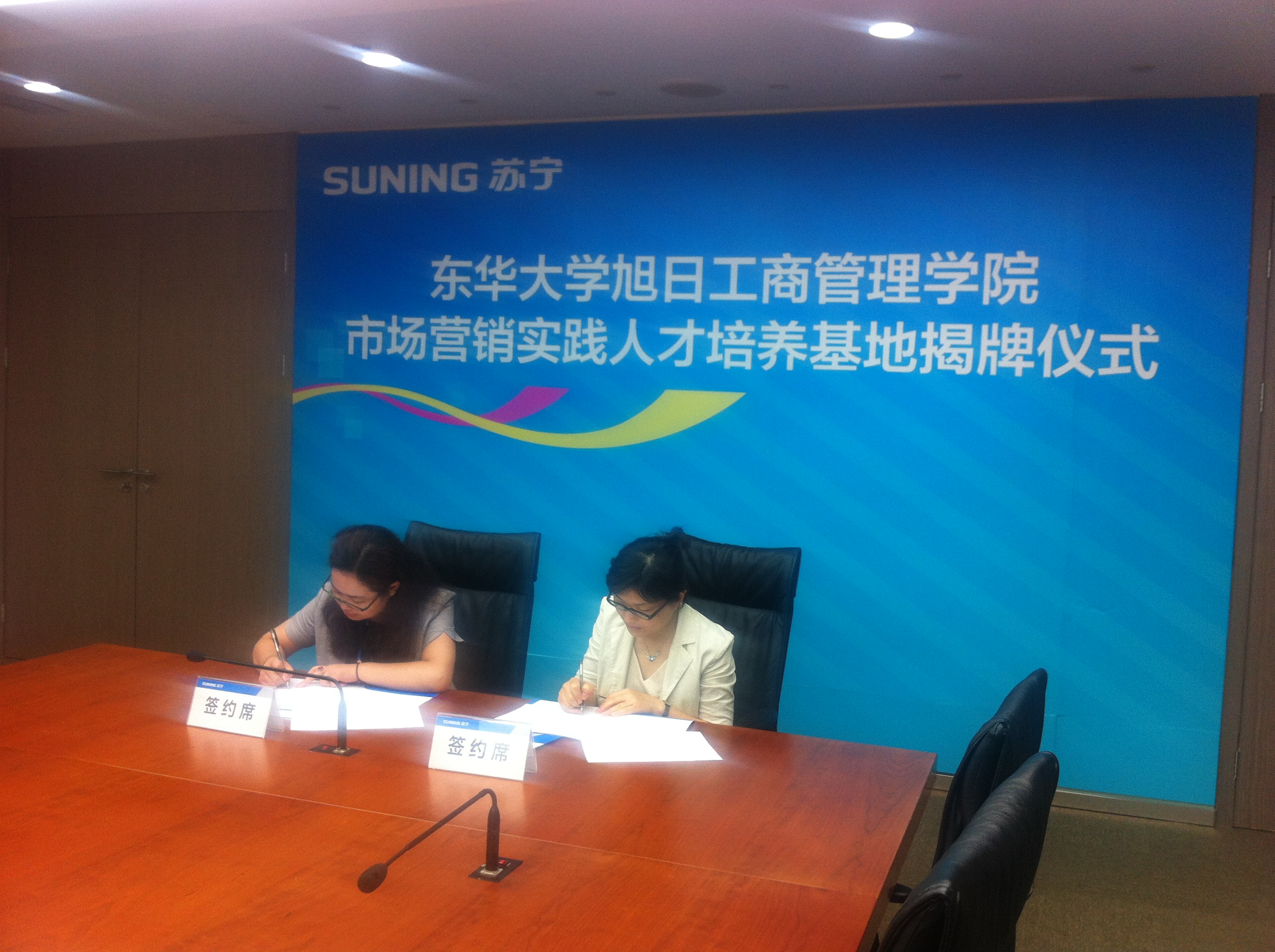 在接下来的环节,苏宁云商王志英经理与彩民之家 刘东胜老师共同签订了《东华大学苏宁云商校园菁英俱乐部合作协议书》、苏宁云商王鲲副总经理与彩民之家 张科静副院长共同签订《彩民之家-彩民之家app 校外实习基地协议书》并为彩民之家-彩民之家app 市场营销实践人才培养基地揭牌。