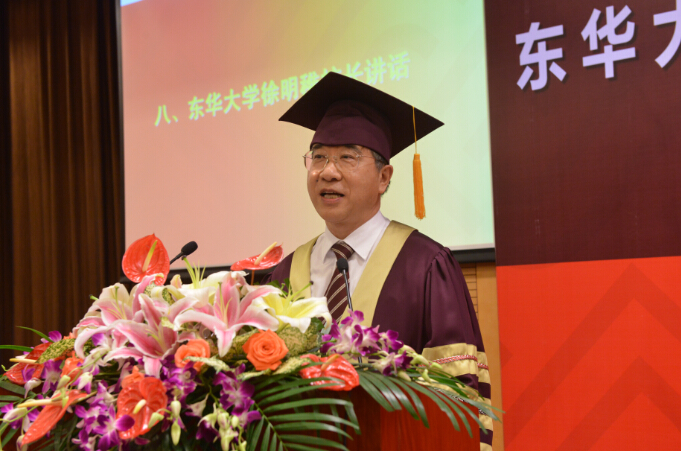 东华大学徐明稚校长向毕业生们致辞。徐校长代表学校党政领导,向各位毕业生表示最热烈的祝贺!同时,也借此机会向中国纺织工业联合会、中国恒天集团有限公司以及关心支持东华大学EMBA教育发展的各界朋友,向承担EMBA教育工作的各位教师和管理工作者们,表示衷心的感谢!在分享喜悦的同时他期望同学们保持东华人身上具有的崇尚实际、脚踏实地、不懈努力、淡泊名利的传统和风格,在人生的事业中发挥自己的聪明才智,以积极、健康的心态面对社会的竞争,不忘初心、坚守理想,做一个胸怀大志、执着、淡定、勤于奋斗的追梦者。 中国纺织工业联合会副秘书长、中国纺织企业管理协会副会长杨峻宣读了中国纺织工业联合会孙瑞哲副会长的书面讲话,通过“担当”、“襟度”、“涵养”、“识见”四个观点,指出人生重要的不是你从哪里来,而是你到哪里去。无论你是企业经营者还是行业管理者,成功的法则是永恒的:担当、襟度、涵养、识见。换言之:天道酬勤,地道酬善,商道酬信,业道酬精。中国需要有知识、有思想、有教养、有境界、有追求的企业家,需要有企业家精神去改变行业的生态,祝贺并祝愿大家成功。 激动人心的学位授予仪式在研究生部主任舒慧生教授宣读了学校学位评定委员会决议之后隆重举行。随着激昂的加冕进行曲,26名毕业生身着硕士服,头戴硕士帽,逐个上台,由校长徐明稚郑重地为他们颁发学位证书和拨帽穗并与每位毕业生分别合影留念,定格难忘的瞬间。这是庄严而神圣的时刻、这是值得一生珍藏的瞬间,每一个微笑的脸庞和骄傲的神情都昭示着学子们此刻的激动、振奋和荣耀。