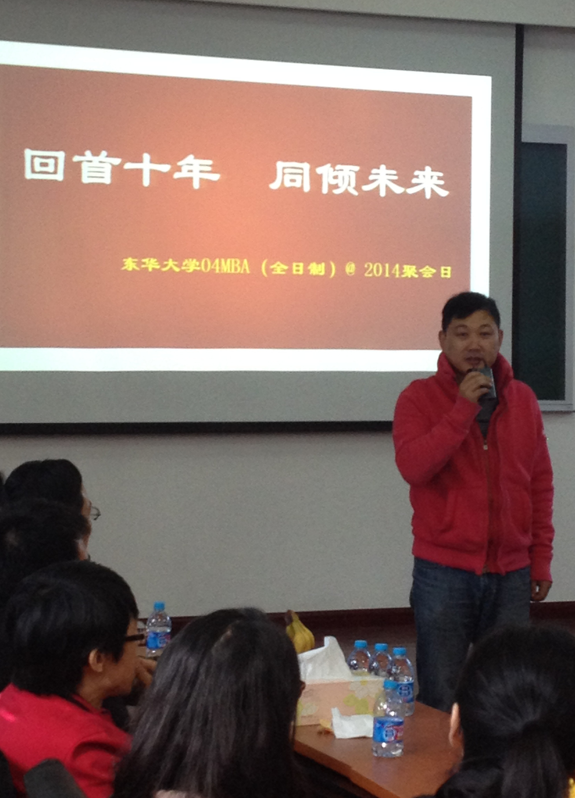 2014年11月15日星期六9:30,旭日楼100教室,04MBA(全日制)1班和2班举行了一场隆重的同学聚会。此次聚会由两个班的班长牵头带领,并由东华大学彩民之家 校友会协助举办,共同纪念同学十年友谊,并携手共迎未来。出席此次活动的嘉宾包括彩民之家 副院长沈蕾教授,彩民之家 校友会秘书长梁传标,副秘书长王磊,以及各班级MBA学生。