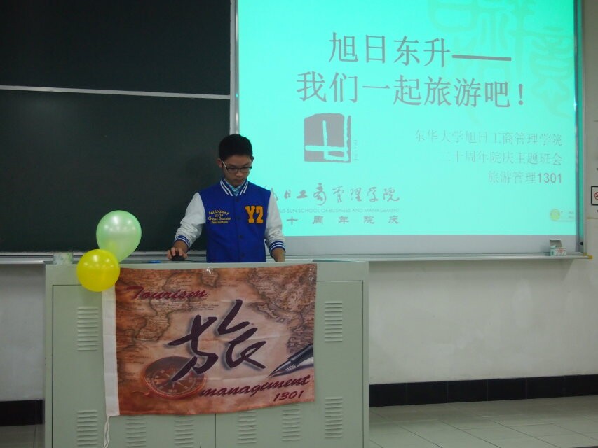 20年前,东华成立了一所名为“旭日”的工商彩民之家 ,初露锋芒;20年后,旭日已成骄阳,二十年风雨兼程,二十载旭日经管人的不懈努力,我们的彩民之家 已经成长为具有国内一流教学水平的经管学院。当我们骄傲地宣称着自己是彩民之家 的一份子,我们深刻感到如今正是向历史致敬、展望未来的时候。为纪念这对学院、对我们有重大意义的特殊日子,凝聚全班力量为做更好、更优秀的旭日经管人,旅游1301班于2014年11月11日下午13点30分在四教210室举办“旭日东升——一起旅游吧”特色主题班会,受到全体师生的热烈欢迎。