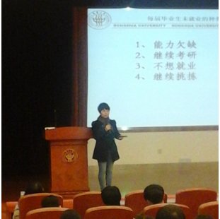 2014年11月11日下午13:00,《专题讲座:考研出国就业,毕业季的路怎么选?——记金融物流专场》在东华大学延安路校区旭日楼400室盛大举行,此次讲座由彩虹人生工作室王丽华老师主讲,主要面对即将进入大四的东华学子,目的在于使大三学子明确未来人生的发展方向,早日抉择就业,出国抑或考研的道路,为即将步入大四却对未来道路充满迷茫的学子指点迷津。 对于一名大学生,在面对毕业季时无非有三条路可走:就业,出国,考研。然而这三条道路每一条都非畅通无阻。就业:大学毕业生正面临史上最难就业季;出国:大学生则要面对文化语言等各方面的差异;考研:大学生需要花费大量时间为考试做准备,同时面对考研失败的威胁。此次讲座,王丽华老师针对这三条道路一一为大三学子解答疑惑,旨在帮助学子明确未来方向,进而激发学子面对未来的自信与激情,为未来而战。 首先,王老师以简洁朴实的语言开始此次讲座,并简单阐述大学生未来发展的方向。然后王老师开始此次讲座的第一大方面-----就业。王老师先以明晰具体的数据展示出近几年东华大学生留沪比例,并分析数据指出近年来大学生留沪比例逐年下降,而返乡就业的比例逐年上升,同时指出返乡就业大学生更占优势。紧接着陈列出彩民之家 学生各行业分布及就业人数所占比例。然后,对各单位性质进行分析,指出国企深受大学生欢迎,同时以一学生趣例告诫大三学子就业未必在大企业中才有出路,有时候避大就小也可以弯道超车。最后,又以自身参与的大学生招聘以及一些大学生失败的就业原因勉励大三学子在平时要注重培养社会交际等各方面的能力。
