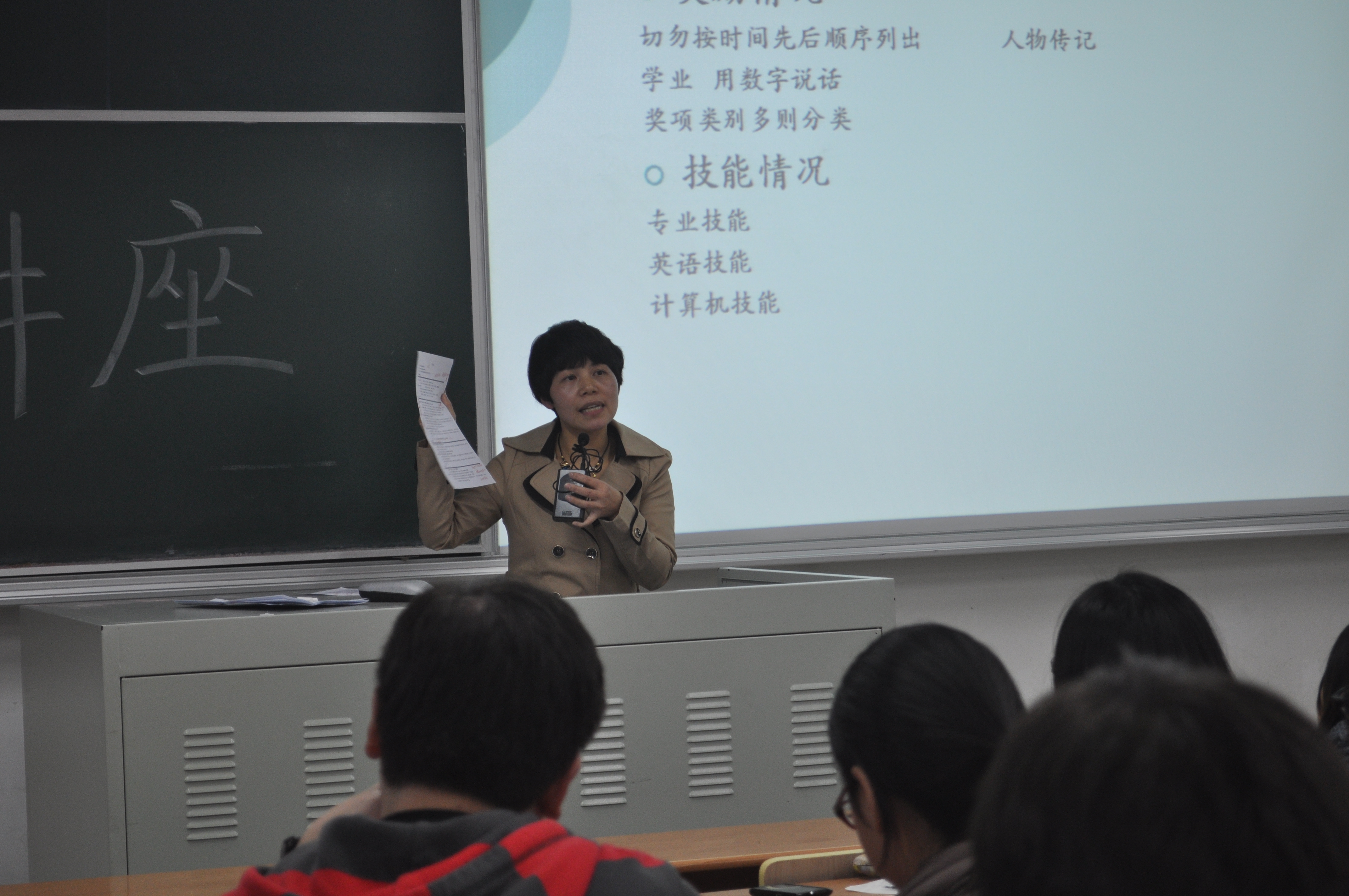 2014年11月19日18:30彩民之家 研究生会举办的职场系列讲座在四教110举行。讲座邀请了彩虹人生工作室福怎、多年主管就业工作的王丽华老师,就应该如何根据应聘岗位做简历、如何应对面试等等问题进行了非常详细的讲解。 整场讲座爆满,时不时爆发出的笑声以及王老师激情富有感染的讲述声吸引了四教其他教室的很多同学。 讲座开场后,王老师以作为苏宁云商招聘的面试官的切身经历作为开场,指出在求职过程中没有经验的应届生在应聘时出现的一些问题,并引出本次讲座的主题,如何通过简历和面试更好地展示自己。