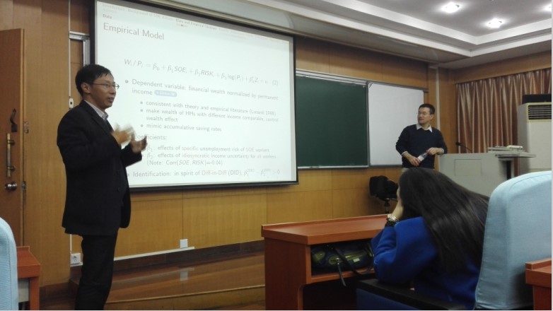 11月21日下午3:00,上海财经大学经济学院博导、“常任轨”副教授朱东明在旭日楼211为我院师生作了题为“如何做高水平的计量实证研究”的学术报告。我院副院长姚洪心会见了朱老师。卢宁文、于君英、陈凌云、周菁、宫汝凯、王满、沈斌、汪达钦等老师和研究生参加了此次讲座。 朱老师以其发表的一篇题为“Breaking the “Iron Rice Bowl and Precautionary Savings: Evidence from Chinese State-Owned Enterprises Reform”的论文开始了其高水平的学术报告,引起了在座同学们的兴趣。朱老师说,做研究的起点是从模拟开始的,学习这个领域权威学者的研究思路、方法和框架,运用到自己的研究中去,弄清楚结果是不是和国外的研究一致,这样一篇好文章就出来了。然后从实证的策略和实证的模型详细论述了如何才能做好高水平的计量实证研究,讲话幽默风趣,博得了同学们的阵阵掌声。