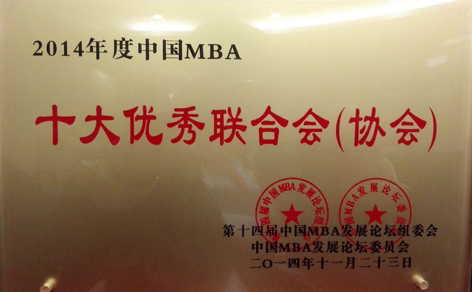 2014年11月23日,第十四届中国MBA发展论坛在北京大学光华彩民之家 隆重举行。期间,东华大学MBA联合会因其出色的服务理念、强大的凝聚力、卓越的领导力荣获“2014年度中国MBA十大优秀联合会”称号。