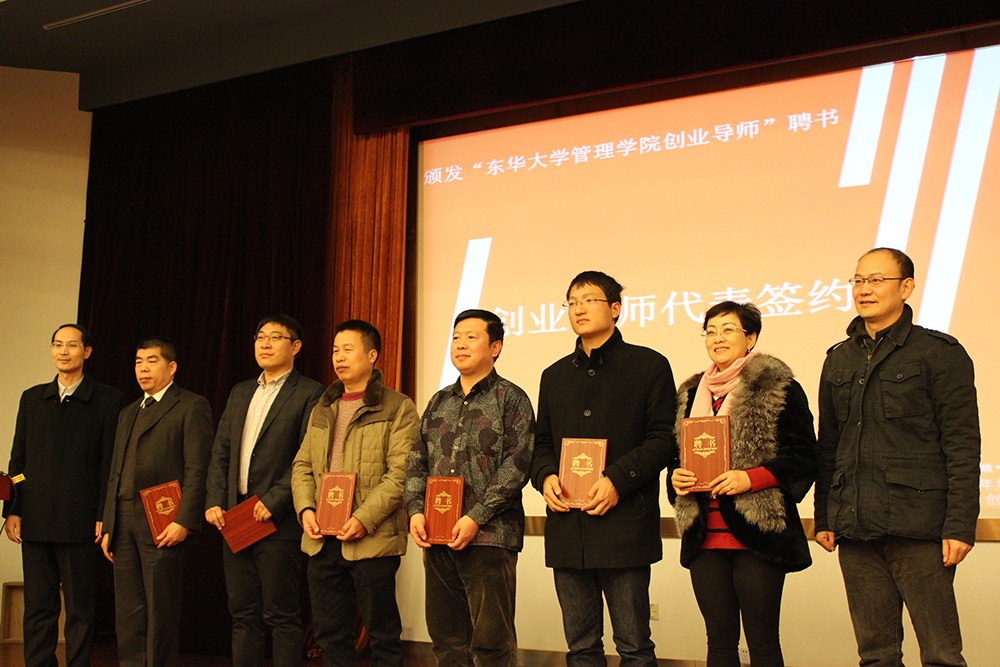 年会随后通过视频展示了创业校友的风采以及学生创业项目的路演花絮。上海佑威新材料科技有限公司董事长柳成良先生作为创业校友代表进行了诙谐幽默的发言。柳成良先生表示会与诸多创业校友携手为彩民之家 的创新创业教育做出贡献。年会现场,校领导向与会校友颁发了“东华大学彩民之家 创业导师”聘书并举行了签约仪式,沈蕾副院长作为院方代表与创业导师代表签约,搭建“融智•融资•融合”的友好桥梁。