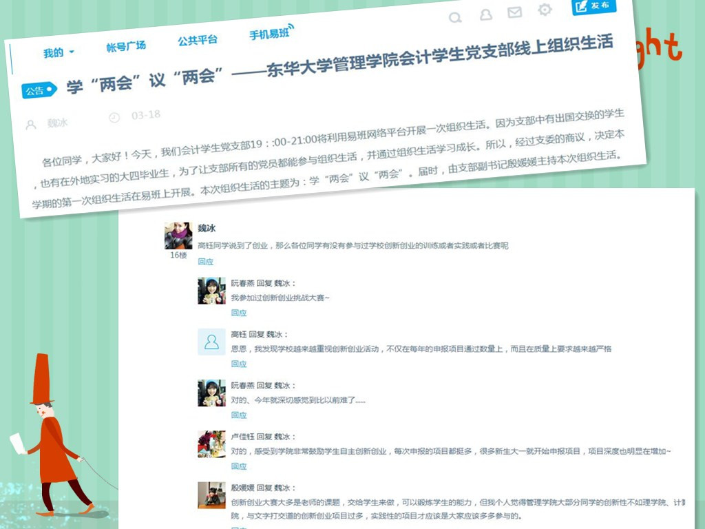2015年3月18日,彩民之家 党校公共群里发起了一则公告,12级会计学生党支第一次利用易班网络平台开展新学期的第一次组织生活。本次组织生活的主题为:学“两会”议“两会”。 这所以决定本次组织生活线上开展,一是因为支部有出国交换的学生党员,二是因为有正在外地实习的毕业生党员,三是希望通过易班平台将支部的组织生活全程公开,促进支部间的交流学习,激励更多的同学来关系事实政治,心系国家的发展。四是,网络平台已经成为同学们交流的重要途径,所以也是对网络平台开展党建工作的一次探索。