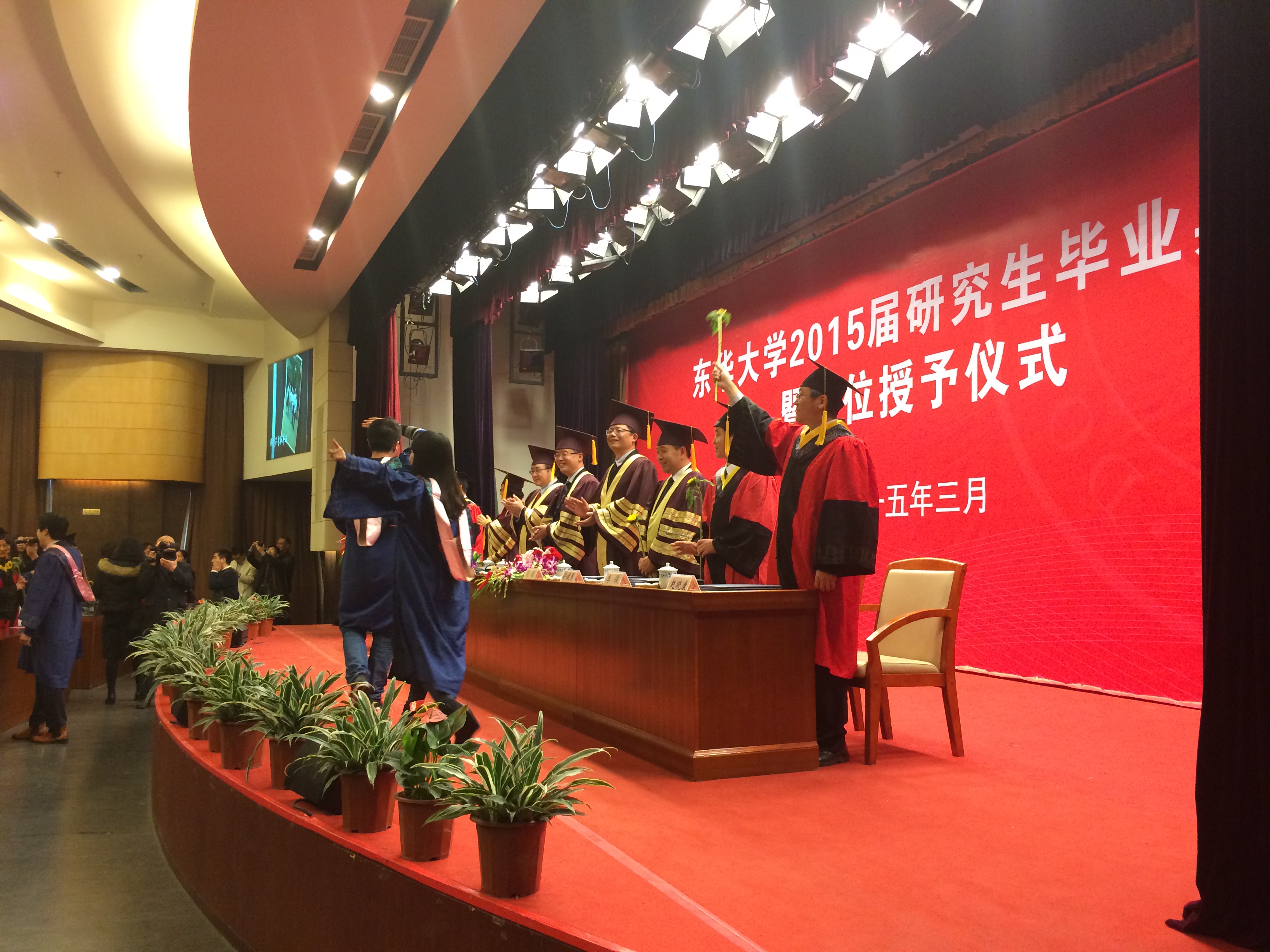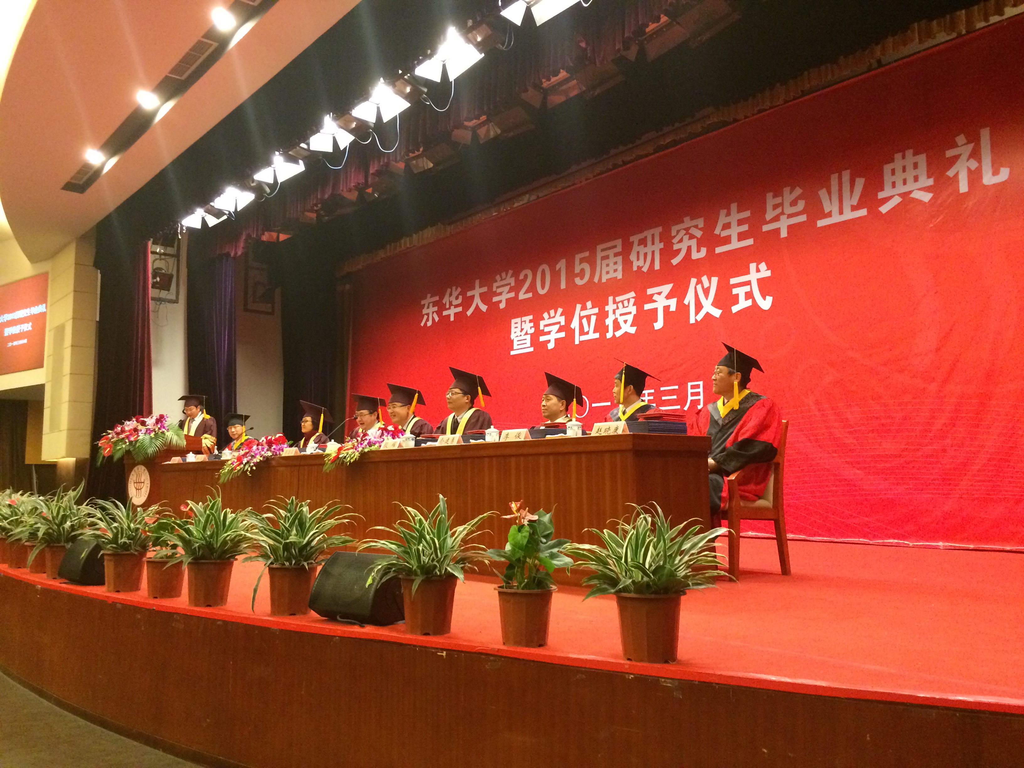 下午,延安路校区2015届研究生毕业典礼安排了很多环节,都有条不紊地进行着。在三教二楼的大厅里竖放着毕业典礼的签名展板,学校也为研究生毕业生提供了免费留影和打印照片的服务,我看见各位同学面带灿烂的笑容,纷纷地在展板上留下了自己的姓名,满怀欣喜地进入到报告厅。毕业典礼于下午一点半在三教二楼报告厅正式开始,本次毕业典礼由东华大学副校长邱高老师主持。第一个环节是公布上海市优秀毕业生和东华大学优秀毕业生,当邱校长读道自己的名字时,我很高兴也很激动,自己两年半的研究生阶段的努力得到了学校肯定,同时自己也对学校充满了感恩之情,没有东华老师的谆谆教导就没有今天的我。
