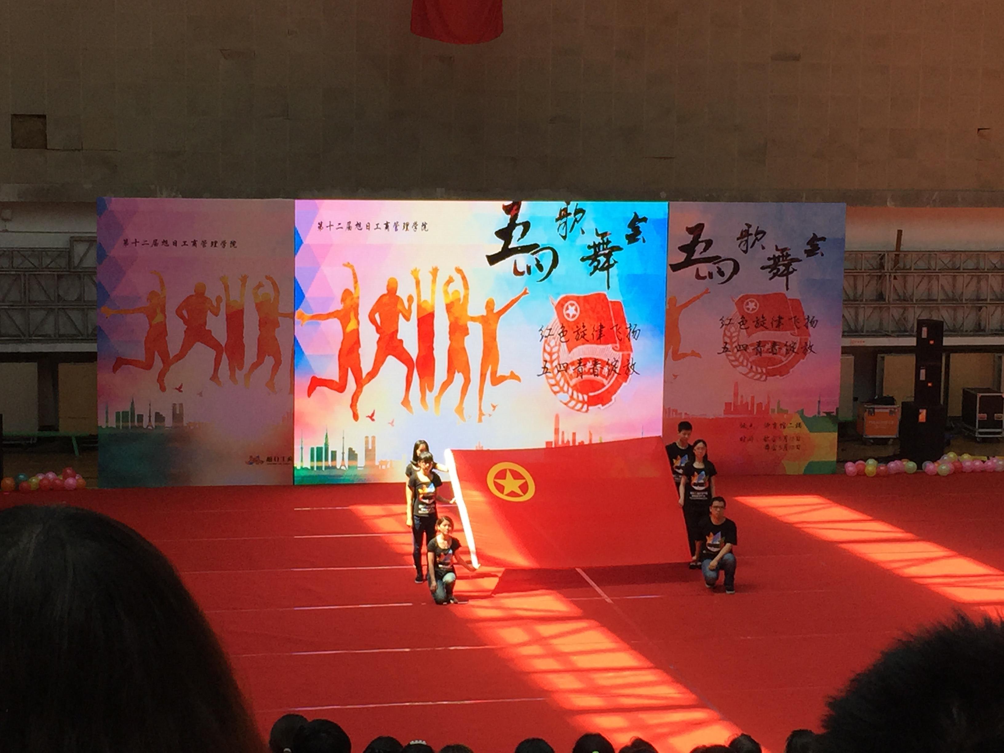 会计1402班黑白配的衣服显得无比整齐;管科1402班的舞蹈更是别具一格,背影妖娆多姿;身着短裙的会经1401的女生更是让现场画风突变;三个节目之后,辅导员带来了表演“奔跑吧辅导员”,欢快的音乐、轻盈的舞姿让同学们感受到了辅导员们的青春活力,迎来了同学们一阵又一阵的欢呼声。经济1403则带来了震撼的扇子舞表演,轻盈的舞姿让现场观众大饱眼福……每个班的舞蹈风格迥异,用激情追寻美丽青春梦,用活力演绎不一样的青春之风。每一位同学意气风发,挥洒着热血,洋溢着青春的气息。 晚上的五四舞会中,物流1301展示他们的歌曲《相亲相爱》;管硕141和144两个班级携手带来的歌曲《站起来》;旅游1301用《龙的传人》与舞龙表演震撼了全场……中场休息的时候,主持人请上了曾获得校园好声音华东赛区一等奖的宿管部陈月萍老师,一曲《花儿为什么这样红》瞬间征服了在座的每一个观众,掌声经久不息。
