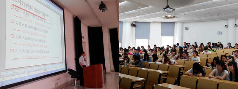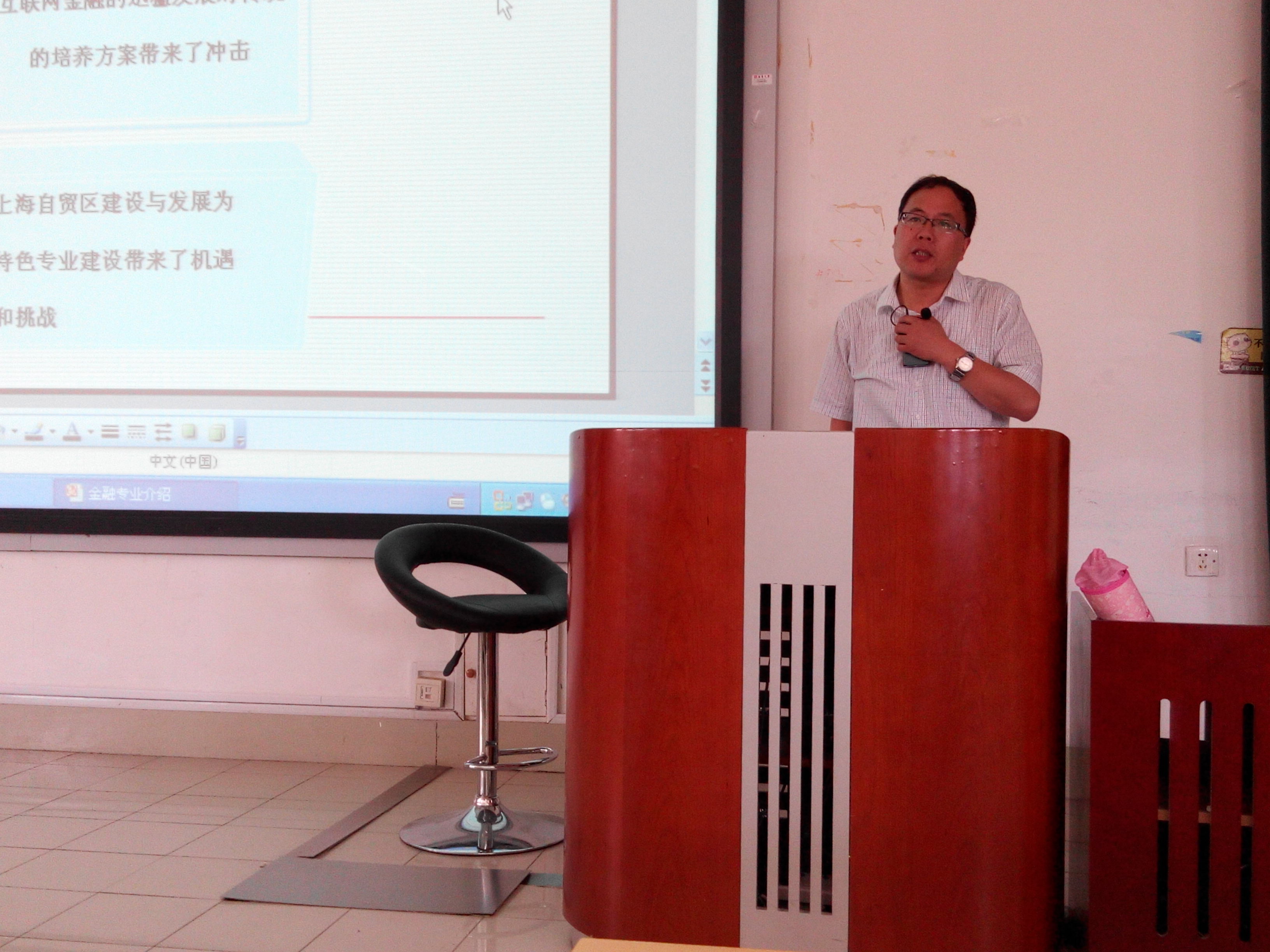 2015年6月9日,彩民之家 在四教203举办14级经济大类专业分流指导会。会议邀请到金融系主任吉余峰老师、国贸系主任张斌老师给14级经济专业学生做专业介绍。