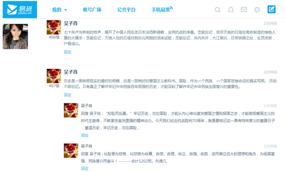 2015年是世界反法西斯战争胜利70周年,也是中国人民抗日战争胜利70周年,为铭记历史,缅怀先烈,激发学生珍爱和平、热爱国家,增强历史使命感和社会责任感,彩民之家 在全院大学生中开展“铭记历史,缅怀先烈,珍爱和平,拥抱未来”——纪念中国人民抗日战争暨世界反法西斯战争胜利70周年主题活动。 会计1202支部的主要负责同学在接到辅导员的通知后,第一时间以各种形式向班内的同学传达了本次活动的内容和要求,并鼓励每一位同学积极参与到活动中来。在管院易班公共平台上,有管院老师专门开了关于抗战胜利70周年的主题帖,其中“三个一”活动能够促进每一位同学进一步了解抗日战争的事件过程。 尽管现在是暑假,同学们不能够共同聚在教室一起讨论。但是同学们集思广益,积极利用身边的其他渠道,如帖子回复互动、朋友圈发感想互评等方式加强了支部同学们对抗日战争的了解和思考。 支部同学积极参加“三个一”活动,利用暑假时间,阅读抗战书籍,观看抗战题材电影,互相推荐,讨论交流,形成了非常优质的学习氛围,进一步增强了大家的正义感、爱国心、民族情。同学们积极参加学院推荐的互动环节,用文字和图片记录下参与各类实践活动的感悟,表达出作为当代大学生的内心成长与进步,也表达出对祖国抗战胜利70周年的最诚挚的祝福。