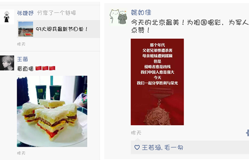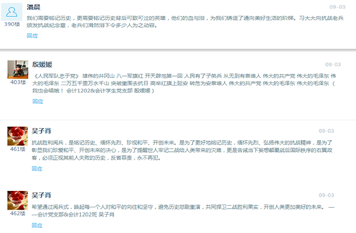 虽然正值暑假期间,但这并不能阻止支部同学积极参加各项活动的热情,支部同学通过多种方式参与到学院组织的活动中并用文字记录下自己的心得体会,同时在支部内部进行了广泛的沟通交流,使本次活动的教育效果最大化。首先,支部同学认真践行了“三个一”活动,主动阅读了各类书籍,观看了如《百团大战》《太行山上》《大抗战》等影片纪录片,参观了烈士陵园、中国共产党‘一大’会址、《铁血云间:松江抗战记忆》大型图片展等教育基地及展会,并用文字记录下自己的心得体会在支部内部进行了线上交流。其次,在易班公共平台上,支部的同学积极发表评论,参与到与整个学院老师同学的互动交流中,尤其在9月3日大阅兵这天同学们的热情达到最高峰,发帖评论达到30多人次。同时,支部同学纷纷自发观看阅兵直播,并在微信朋友圈等网络平台发表评论表达由衷的民族自豪感和对历史的追忆沉思。