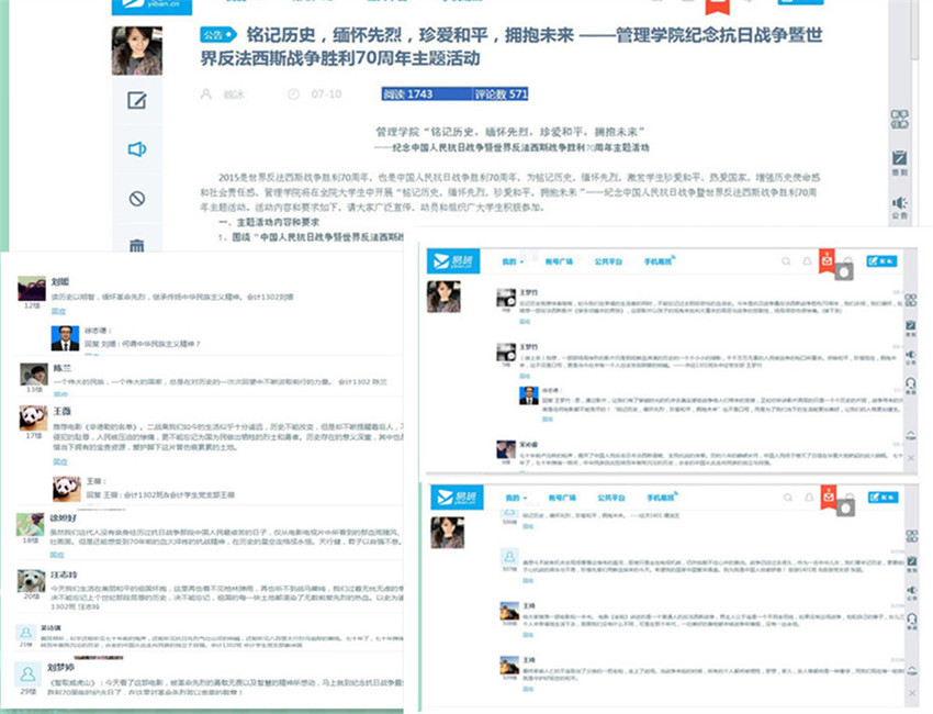 2015年是世界反法西斯战争胜利70周年,也是中国人民抗日战争胜利70周年,为铭记历史、热爱国家,增强历史使命感和社会责任感,彩民之家 在全院学生中开展“铭记历史,缅怀先烈,珍爱和平,拥抱未来”——纪念中国人民抗日战争暨世界反法西斯战争胜利70周年主题活动。本次主题活动包括“看一本书”、“观一部影片”、“讲述一个故事”的“三个一”活动;主题征文、演讲比赛以及纪念中国人民抗日战争暨世界反法西斯战争胜利70周年书法征集评选等多种形式,各党支部和团支部在暑期通过易班、微信等网络平台积极互动和讨论。 7月中旬活动开始,在彩民之家 易班公共平台上,学生参与度和讨论热烈程度都达到了历史新高。活动中,彩民之家 学生分享了自己践行主题教育活动的收获和感悟。在彩民之家 易班公共平台发布的“三个一”活动主题贴上,阅读人数和评论人数都创下新高。据统计,截至9月6日上午9:00,主题帖阅读人数达 1743 人,评论数达571人次。各党团支部通过看书,不仅在书中寻史,更是在寻爱国情怀;通过“观一部影片”,穿越光影,到达历史现场,去领略革命先烈的英雄气概;在“铭记历史,缅怀先烈”主题教育实践展活动中,通过实地走访参观,同学们触摸到了历史岁月痕迹,真真切切地感受到了战争带来的灾难和牺牲,更加珍爱和平! 9月3日,当习近平总书记在天安门城楼与各国元首举行纪念活动并进行盛大阅兵之时,学生们纷纷端坐在电视机、网络电视旁观看现场直播,他们边看直播边发帖互动,表达了内心的真实感受:会计1201班俞洋同学评论道,“全家都在看阅兵仪式,热血沸腾,作为一个中国人感到无比的骄傲和自豪!”经济1402班唐建云同学评论道,“70响礼炮中,整齐的队列向我们走来!震撼!”我院退伍学生会计1202班殷媛媛评论道,“阅兵式太帅了!!!我要是留在部队兴许也就有机会,去参加了呢!”……