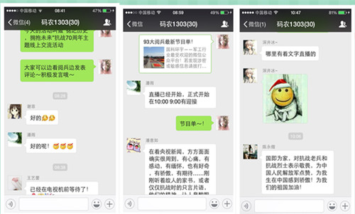 铭记历史提升民族凝聚力,科学奋斗致力振兴中华邦 ——信管1303纪念抗日战争胜利70周年线上交流活动通讯稿 2015年9月3日上午8:30至12:00,信管1303的同学们在班级微信群里开展了 “铭记历史,拥抱未来”——纪念抗日战争胜利70周年线上交流活动,同学们一边看着阅兵直播,一边发表着自己的看法与心声,思想火花迸射,气氛活跃。 上午8:30,李齐同学在班级群里号召大家一起参与“铭记历史,拥抱未来”——纪念抗日战争胜利70周年线上交流活动,得到同学们的热烈回应。9:00国家领导人习近平会携夫人迎候各国嘉宾,但同学们已经早早等待在各种屏幕前,期待着阅兵仪式的开始,有的同学还在返校的路上,无法观看视频直播,便通过网络渠道观看文字直播,不愿错过这激动人心的一刻。上午10:00,纪念大会正式开始,群里的讨论愈发热烈。当礼炮响起,庆祝着中国人民抗日战争70周年纪念活动正式开始,礼炮先烈而鸣、为胜利而鸣!国旗护卫队从英雄纪念碑沿中轴线正步行进到国旗杆处,黄鼎康同学流露出对护旗手的崇敬与羡慕:“他们坚定的步伐,响亮的口号,在像世界宣示,我们有捍卫正义的能力。他们的帅不在颜值,在那股凛然的正气!。”入党积极分子赵梦竹同学更加坚定了心中对党不断靠拢的决心,发表了“为人民服务是每一个兵,也是每一位党员的宗旨。爱祖国,爱社会,全心全意为人民服务。”紧接着,国家主席习近平发表重要讲话,铭记先烈,肯定了中华人民70年来的艰苦奋斗,坚定了我国继续向着目标奋勇前进和维护世界和平的决心,呼吁铭记历史,缅怀先烈,珍爱和平,开创未来!陈永熠同学道出心声:“从习主席的讲话中又一次体会到曾经的牺牲是为了现在的自由。以史为鉴,爱国情怀在任何时候都应该铭记在心。”10:30,阅兵仪式的开始将群里的讨论推向了高潮,听着那一句句浑厚而熟悉的“同志们好,同志们辛苦了!”,李齐同学满怀激动地说:“‘同志们好,同志们辛苦了!’短短两句却浓缩了亿万同胞对抗日战争胜利70年来重建家园,在富强民主文明和谐道路上前进的自豪,以及对繁荣富强未来的愿景,更是一代代军人为世界和平奉献的奏歌。”今日微博上的一句“知道为什么今年反法西斯70周年要搞的这么隆重吗,因为可能下一个十周年就没有老兵了”触动了亿亿万同胞的泪点,当抗战老兵方队出现时,一位老兵难抑心中万千心情抹泪的场景让群里的同学鼻酸眼热,感动与崇敬交织却难以言语,直到老兵子女方队驶入时,李齐同学才打破群里的沉寂:“看抗战老兵出来的时候已经热泪盈狂,英雄不朽,抗战精神薪火相传,他们的身后是抗战老兵的子女,未来路上还会面对很多的困苦艰难,抗战精神在新的时代将会解读成新的意义,而我们就是新精神的践行者。”看着屏幕上整齐划一的队伍,陈永熠同学发出心声:“这些挺拔刚毅的军人们此时此刻正在向祖国、向世界展示着他们的生命力和爱国热情。而其他人,在祖国其他岗位的人,也应受此精神的感染,在自己的岗位上为祖国献出自己的力量。而我们,作为当代大学生,更要明确自身义务,努力学习,提升自身能力,将来争取在各行各业为祖国的前进做出贡献。”