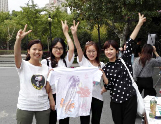 “快快快!”不远处传来兴奋的声音,随之而来的第9小组同学们出现在工作人员的视线中,率先完成游戏,拔得头筹!紧接着,其他几个小组也集齐了缤纷手印,快速跑回起点,秀出斑斓的衬衫,展现着自己辛苦奔波取得的成果。