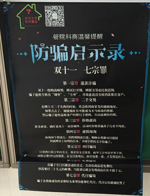 “双十一”当天,科学商店的微信平台“DHUSC信管科普服务站”也相应地发布了关于防诈骗的推送,推送内容详细讲述了当前黑心商家惯用的手段以及应对措施,使同学们在快乐网购的同时擦亮眼睛,避免不必要的经济损失。 保卫处姚建强老师表示:通过本次“双十一”防诈骗活动的宣传与开展,让更多的同学对于网购诈骗有了更充分的认识,提升了同学们的自我防范意识,为校园安全稳定做出努力。 (撰稿:夏磊、丁伟)