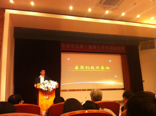 论坛主题:博士学术论文竞赛 举办地点:东华大学旭日楼400 举办时间:2015年11月3日 18:30—21:15 2015年11月3日周二下午18:30分,管硕152班的同学积极观摩了在东华大学旭日楼400举行的管院第一届博士学术论文竞赛。此次竞赛邀请了管院各个专业不同学术领域的专家教授组成阵容庞大的评委团,亲临现场对参赛的博士论文进行点评,如姚洪心教授、顾庆良教授、宋福根教授等,以及组织此次博士论文竞赛的众位老师共同参与,如王丽华老师、周蓉老师等。