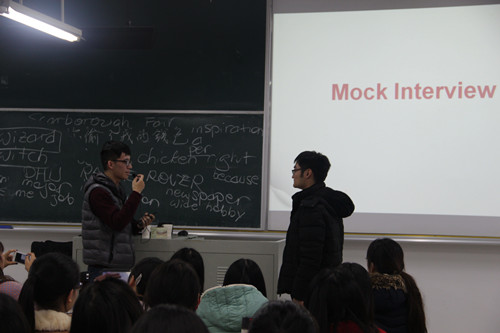最后是模拟面试环节,杨老师邀请两位同学上台分别扮演面试官和求职者。通过两位同学台上的模拟面试,指出面试中的需要注意的礼仪,面试中求职者如何运用自己的肢体语言以及如何巧妙的应对面试官的提问等。