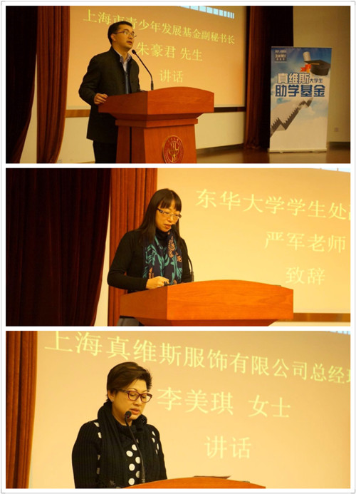 2015年12月8日下午,“真维斯大学生助学基金”颁发仪式在东华大学(延安路校区)旭日楼400报告厅拉开序幕。本次仪式由东华大学学生处资助科李静老师主持,到场嘉宾有:上海市青少年发展基金会副秘书长朱豪君先生,上海真维斯服饰有限公司(以下简称“真维斯公司”)总经理李美琪女士、培训部经理李莺女士、推广部经理宋美霞女士、行政部经理刘玺女士,上海工程技术大学服装学院辅导员王安浩老师,东华大学学生处副处长严军老师,彩民之家-彩民之家app