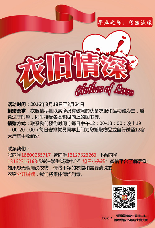 如果您愿意,需要您做的只是拿出衣服,我们研一党支部将提供集中清洗、分类和邮寄的工作。多少善心不如一次善行,赶紧扫一扫联系我们吧!