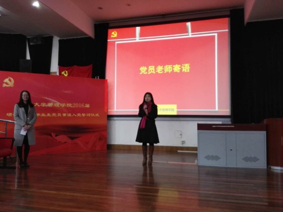 仪式中,通过一个视频回顾了管硕131党支部、132党支部和管硕134党支部全体党员的入党历程。看似简单的十几分钟的视频,却是浓缩了每一个党员积极加入党组织的几年时光,通过镜头,每个毕业生党员恍惚穿越时光隧道,回顾了自己的入党历程。视频结束后,彩民之家 133硕党支部的王佩作为毕业生党员代表分享自己三年的感悟与收获。