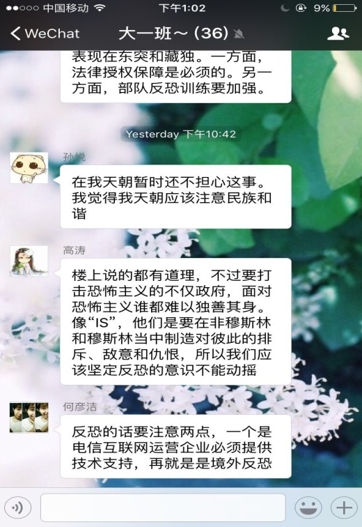 对此袁欣怡、郭蓉、孙世琪等同学立即反对“2013年国内的新疆巴楚的暴力袭击事件、2014年的昆明火车站事件都是恐怖事件,最好的方法是加强国与国之间的合作,中国也应该紧绷反恐防暴安全弦,主动参与反恐防范。“