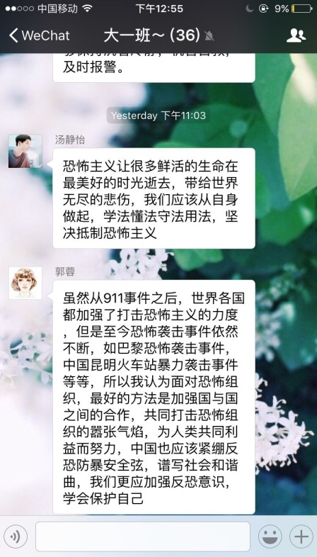 《中华人民共和国刑法修正案(九)》和《中华人民共和国反恐怖主义法》在经中华人民共和国第十二届全国人民大表大会常务委员会第十六次和第十八次会议通过后分别于2015年11月1日和2016年1月1日起正式施行。由于近年来一些地方多次严重暴力恐怖案件的发生和网络犯罪的形成,新修正的《刑法》增加了对宣扬及参与恐怖主义的行为犯罪规定,而中国首部反恐法的推行更是体现了近年来国家对全民反恐及维护国家安全、社会稳定、经济发展、民族团结和人民生命财产安全的重视。 为了深入贯彻这两部法律,并让同学们在思想上高度重视,领会《反恐怖主义法》和《刑法修正案(九)》的政治意义和法律意义,同时增强大家的反恐意识,金融1301班于2016年4月9日晚22:30于班级微信群中开展了总长一小时的有关“学习《中华人民共和国刑法修正案(九)》及《中华人民共和国反恐怖主义法》”的线上主题班会。意在通过多样的线上形式,让同学们对这两部法律进行学习、解读和思考,发表自己的意见。并利用相关案例展示及答题的方式,进一步加强大家对其内容的理解。 首先,在线上班会开始前,各班委从相关网络渠道搜集了近三年中发生的国际国内恐怖事件相关资料、图片、视频等材料,其中以受我们同学关注巴黎恐怖袭击事件为主,之所以选择这一事件是因为考虑到金融1301班在2015年下半学期出国交换的同学较多,其中有5位同学曾在这段时间内于巴黎及其周边城市交换或游玩,当时这一事件的发生引起了大家对这些同学的关心,在微信群里主动发起慰问并在朋友圈中转载相关防恐怖袭击彩民之家相关的文章。班委们认为利用巴黎恐袭事件能最大程度激起同学们对恐怖主义事件的关注,从而增强自身对反恐怖主义法学习的热情。并将两部法律的相关文字内容提前发布到班级上微信群,供大家熟悉了解。为了更有效地让同学们投入到反恐法学习中,班委们还准备了知识竞赛环节,通过从两部新增法律条文中提炼10道问答题,作为大家最终学习成果反馈的形式。 4月9日22:30,班会正式开始。同学们先观看了于2015年11月13日晚发生的巴黎恐怖袭击事件视频。在观看完视频后,部分同学发表了自己对这一事件的感想。张漂同学表示自己在事件发生的前三天恰巧在巴黎,并且还经过了发生恐袭事件的地点,她透露恐袭前的巴黎仍然非常平静,大家都和往常一样生活,完全想不到如此危险的时间会发生在自己身边,并对此表示后怕。蔡运婧同学也透露自己当时在事件发生前一天还在该地点周围的宾馆居住,归返后觉得很害怕。听闻几位身处巴黎的同学对这一事件的感想后,张一枫、蔡玉娇、金舒云、余建兴、徐凯飞、罗煦丹等同学用理性的思维发表各自对此事件发生的原因。