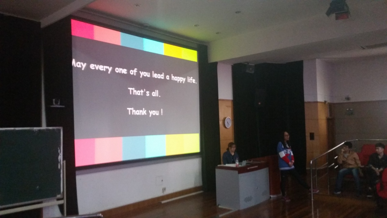 在有趣的心理分析之后,大家又一起观看了《You are more beautiful than you think》的短片,同学们都被深深地吸引其中,也学到了正确的看待自己,对自己要满怀信心,不要妄自菲薄。接下来的互动游戏:“你来比划我来猜”,将这次班会推向高潮。在同学的热情配合和强大的脑力参与下,决出了完成猜题速度最快的一组,展示了同学之间要学会配合,才能高度默契,完成任务。