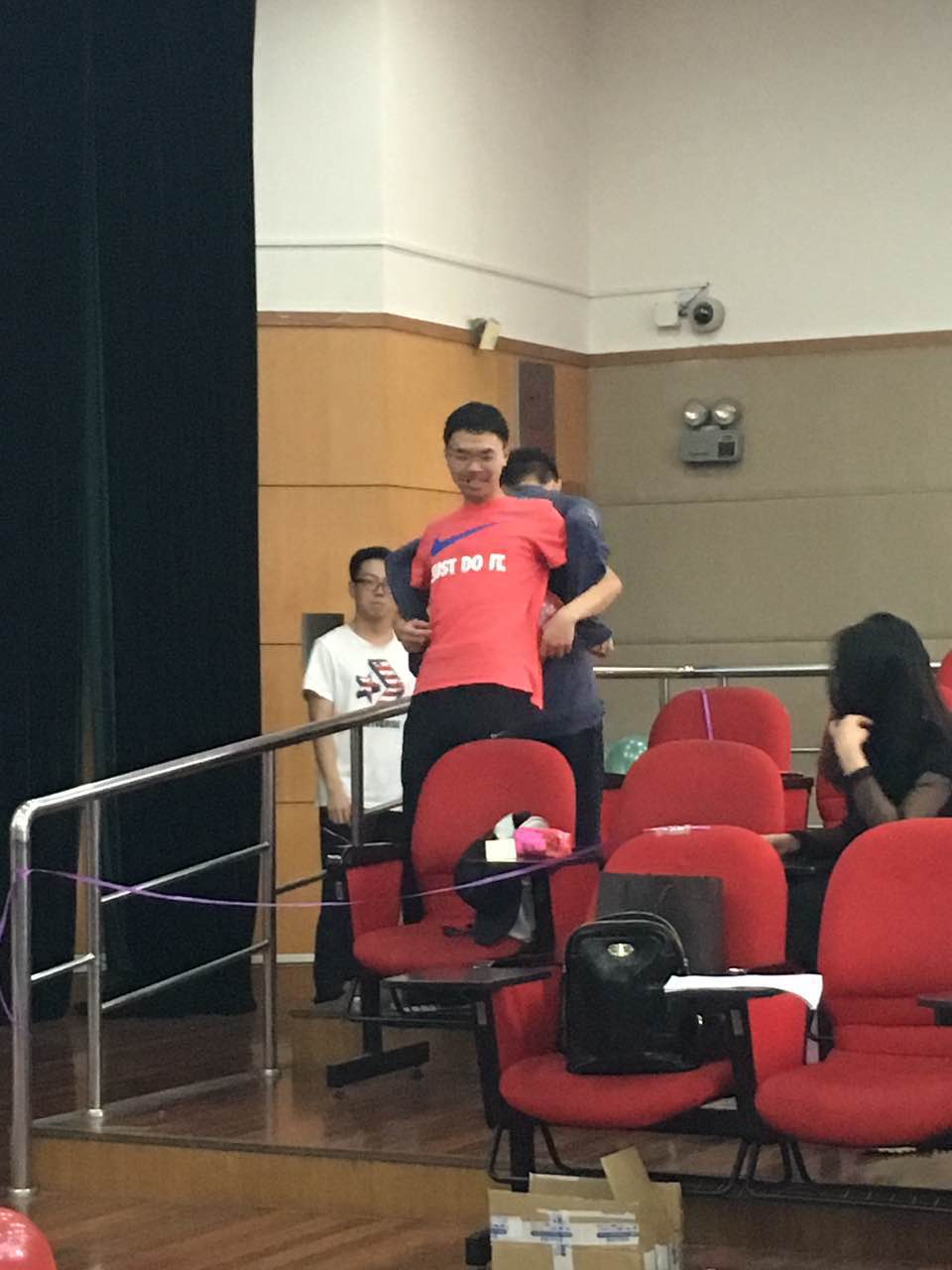 首先,蔡浪本明确了本次班会的目的是增进同学对自己和对他人的认识,在春暖花开的季节放飞心情,拥抱精彩人生。其后,通过游戏“鸡鸭对讲”进行班会预热,活跃了现场的气氛。紧接通过精心设计的“穿越雷区”和“信任之旅”两个游戏环节,增强同学之间的合作和信任,使全班同学懂得与人合作和信任的重要性。