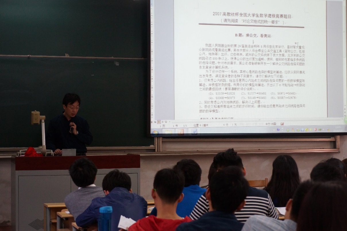 5月3日下午,的第一次培训课在延安路校区1教109开展。俱乐部请来了松江理学院副教授尤苏蓉老师,尤老师为同学们细致讲解了优化方法在数学建模中的应用,结合具体案例分析,让大家受益匪浅。本次培训课由数模俱乐部主办,出席本次培训课的主要是东华大学本科生与研究生。