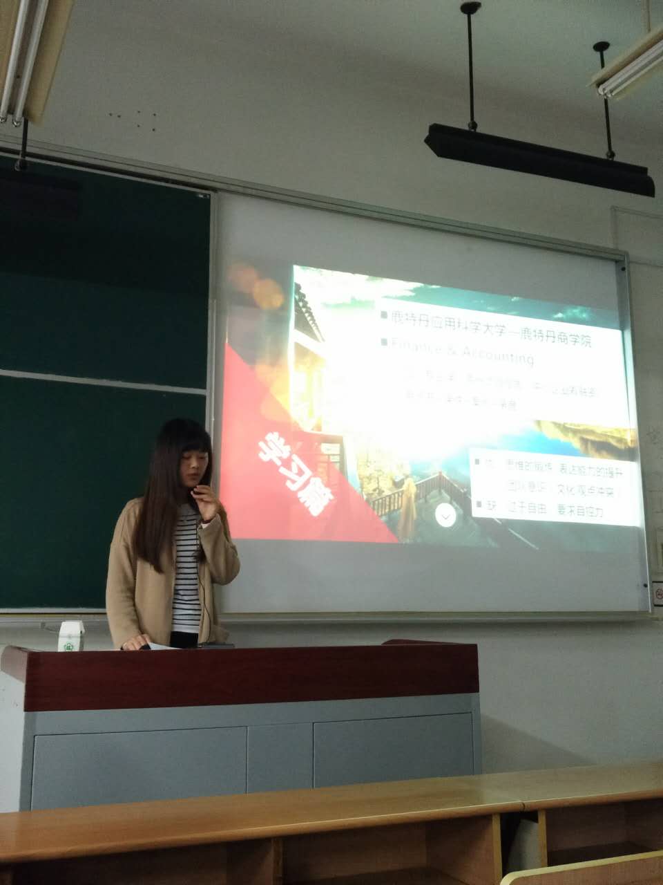 最后分享的是荷兰鹿特丹大学的王梓同学,王同学用一个小视频向我们讲述了她在荷兰的生活,表示这或许将会是她大学生活中最浓墨重彩的一笔,在场的同学们听了她的分享,对出国交换也更加期待了。