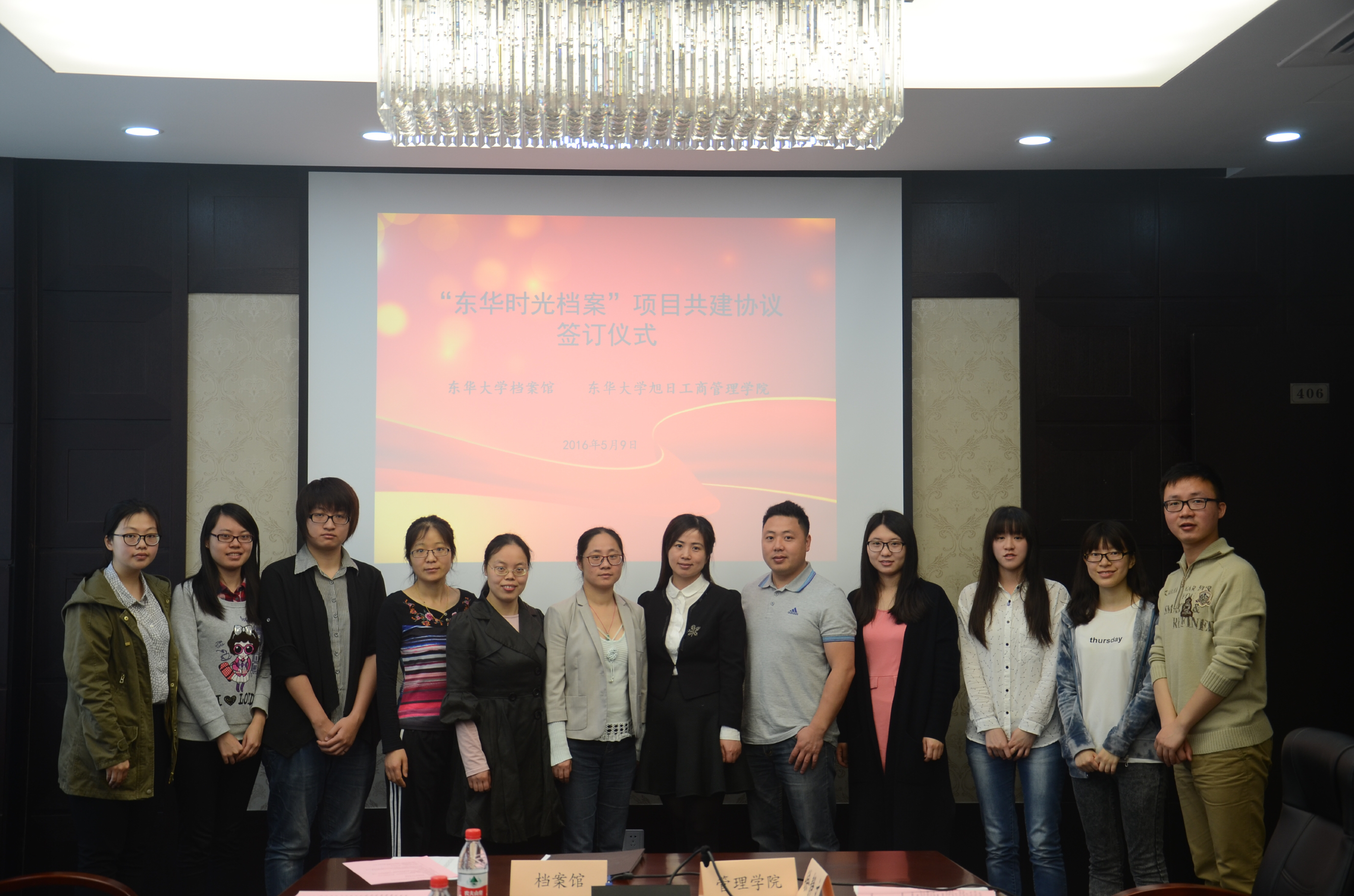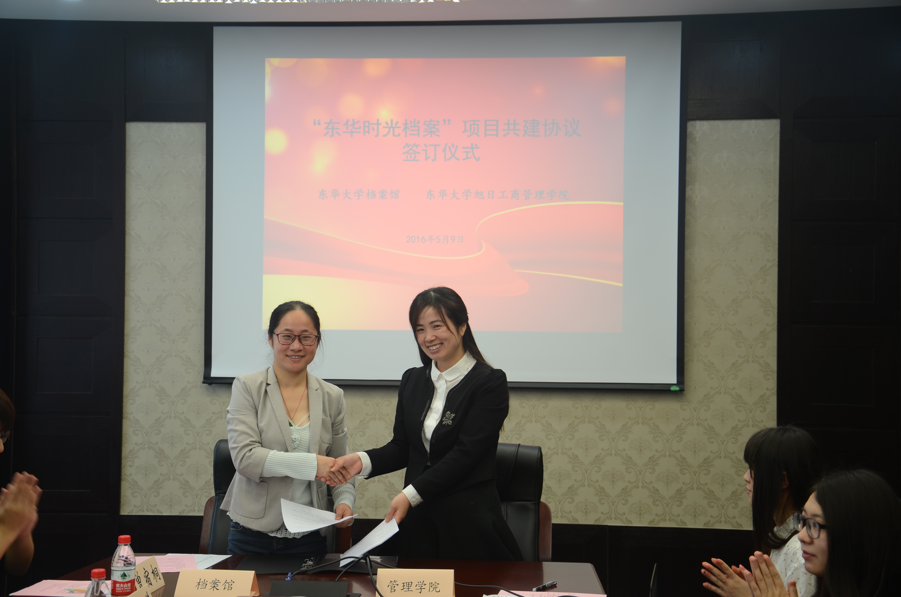 5月9日,“东华时光档案”项目共建协议签订仪式在延安路校区正式举行。档案馆馆长沈洁、彩民之家 党总支副书记叶晓燕出席,并代表合作双方签署协议。项目指导教师档案馆编研室张燕、崔敏华,学生管理办公室副主任蓝维春、分团委书记丁伟、学生党建主管吴娅琳以及部分志愿者代表参加项目共建仪式。 “东华时光档案”项目旨在“讲述东华故事,传承东华记忆,弘扬东华文化”,计划采用专题访谈形式,开展有关校史人物、实物、事件访谈,挖掘和积累口述校史资料。项目首期计划在党代会期间采访有关老领导、老代表,回顾东华发展历程,钩沉改革变迁中的东华故事。成果一方面作为档案馆口述校史资料留存,另一方面通过“东华校史”“DHU小管家”等多媒体平台宣传推广。 档案馆馆长沈洁为项目正式启动致辞。她从口述校史发展趋势、抢救东华记忆的必要性等方面介绍了项目动因。她期望经过一段时间的探索,能够“形成一个品牌”,即以口述校史、“互联网+”校史为特色的大学记忆品牌项目;“锻炼一支队伍”,凝聚一批有志于东华记忆挖掘与传播的专兼职力量;“推出一批成果”,以多角度、多形式的成果服务学校建设发展。 叶晓燕表示,学院党总支将对项目予以大力支持,通过依托彩民之家 分团委记者团和学生党建中心骨干力量,结合档案馆的优势,取得实效。她指出,口述校史不仅能增加同学对校史的了解,激发对学校的情感与认同,还能够锻炼学生在访谈、记录、写作、音视频制作等方面的专业知识,提高核心竞争力,更好地应对将来的工作需求。 志愿者代表徐静文、魏宇琪同学发言,表示将忠于历史原貌,记录东华的发展变迁,并在活动中提升锻炼自我。