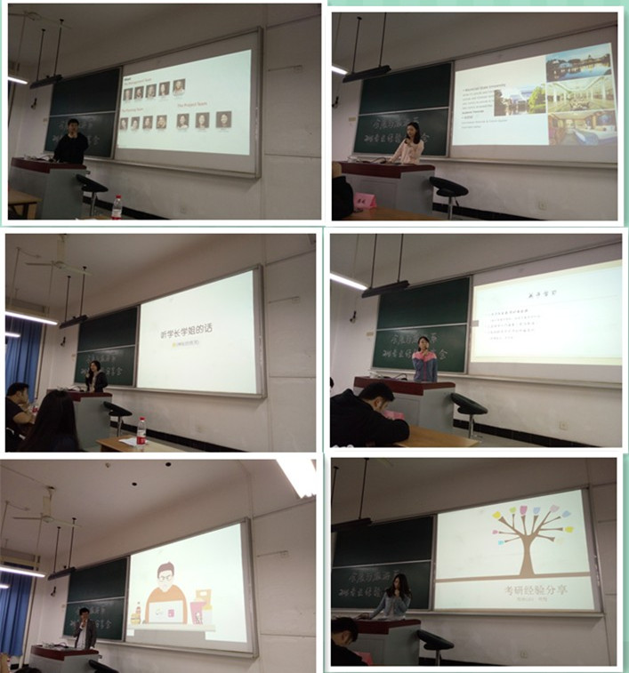 然后,选择国内外升学的2016届毕业生学姐们也给大家做了简要分享。何艳学姐拥有与众不同的大学生涯,她从一个“没长大的贪玩孩子”到勇敢参军磨练,再到无畏追梦,最终圆梦复旦,其中的不易令人赞叹。对于考研,她有的放矢地选取关键信息点给与大家指导,比如如何决定方向和目标,如何制定复习计划、把握时间等。她鼓励大家把心态放平,用努力去成就自己。韩亚男学姐已经被报送至本校研究生,她十分细致的给大家讲解了保研的政策,并结合自身经历,提出一些非常实用的建议,让向往保研的同学有了更清晰的努力方向。伍芮莹学姐即将前往瑞士理诺士国际酒店彩民之家